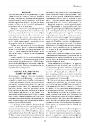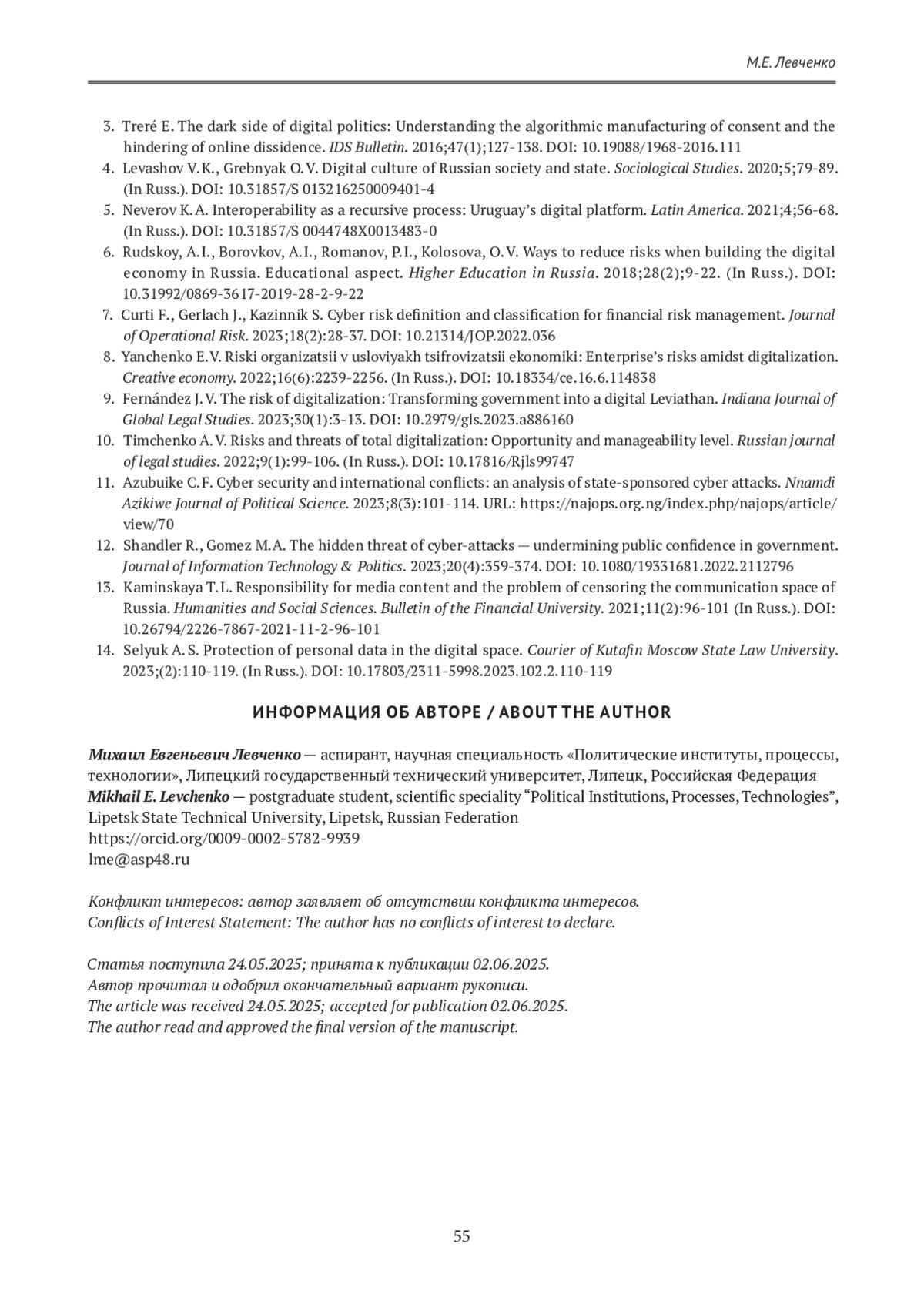 10. Тимченко А. В. Риски и угрозы тотальной цифровизации: возможности и потенциал управляемости. Российский журнал правовых исследований. 2022;9(1);99-106. https://doi.org/10.17816/Rjls99747