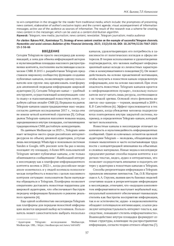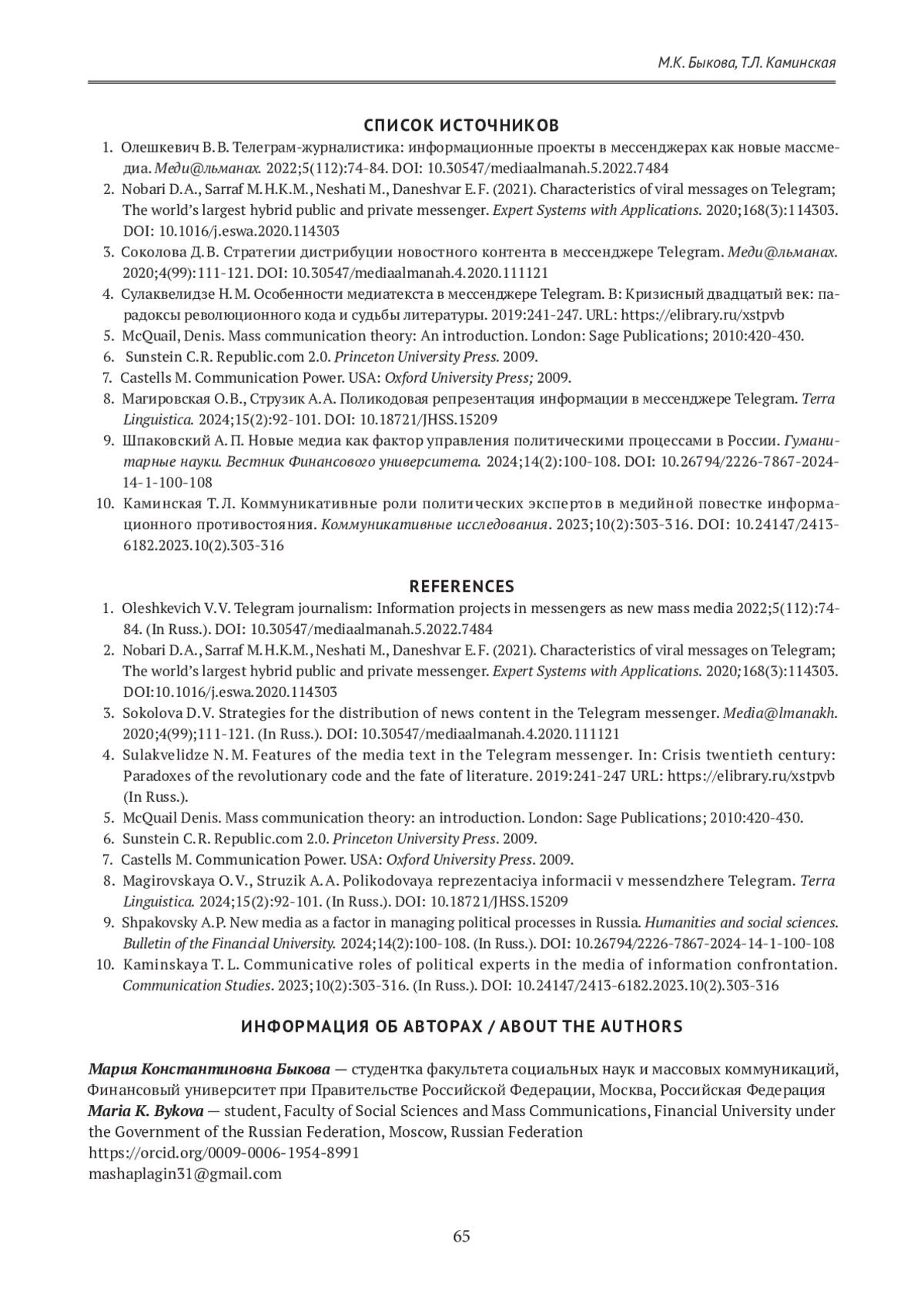 1. Олешкевич В.В. Телеграм-журналистика: информационные проекты в мессенджерах как новые массмедиа. Меди@льманах. 2022;5(112):74-84. https://doi.org/10.30547/mediaalmanah.5.2022.7484