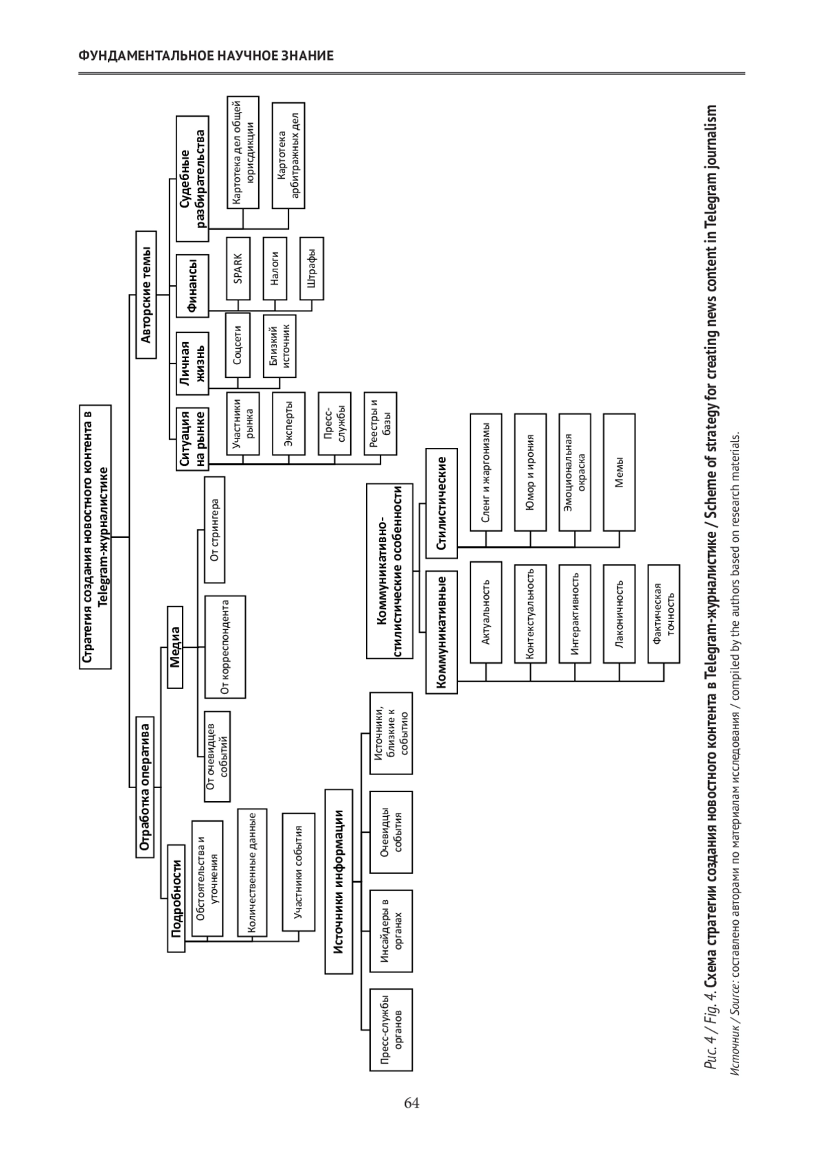 Методическая база. Контент- и дискурс-анализ помогли авторам выявить стратегии создания и дистрибуции новостного контента крупнейших Telegram-каналов категории «Новости и СМИ». Выбор материала исследования обусловлен тем, что в 2023 г. они вошли в топ-3 новостных Telegram-каналов по цитируемости в российских СМИ. Результаты исследования показали, что новые новостные медиа в мессенджере имеют свои особенности, и их работу можно выделить в отдельное современное направление — Telegram-журналистику. Можно прогнозировать, что, поскольку мессенджер является стремительно растущей площадкой, инструменты платформы позволят более активно развивать журналистику в Telegram. В статье выделены стратегии, позволяющие успешно конкурировать за читателя с традиционными СМИ: оперативность подачи новостного контента; проработка авторских эксклюзивных тем и текущей повестки; визуальное сопровождение информационных сообщений; активное использование аудитории как источника информации.