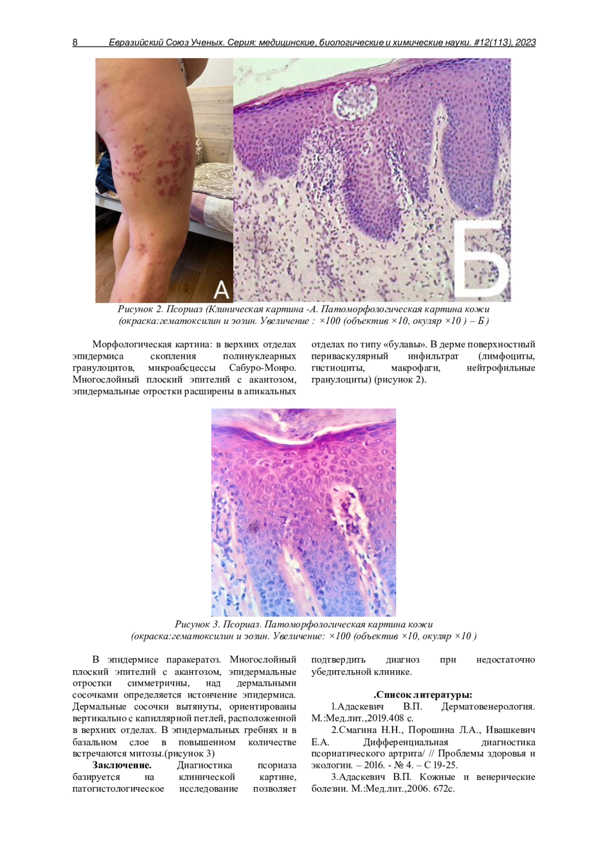ДАНИЧ А., КАСПИРОВ Р.А., ОРОШИНА Л.А. ПАТОМОРФОЛОГИЧЕСКИЕ ИЗМЕНЕНИЯ КОЖНЫХ ПОКРОВОВ ПРИ ВУЛЬГАРНОМ ПСОРИАЗЕ. КЛИНИЧЕСКИЙ СЛУЧАЙ // ЕВРАЗИЙСКИЙ СОЮЗ УЧЕНЫХ. СЕРИЯ: МЕДИЦИНСКИЕ, БИОЛОГИЧЕСКИЕ И ХИМИЧЕСКИЕ НАУКИ. 2025. №12 (113)
