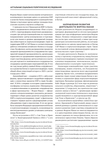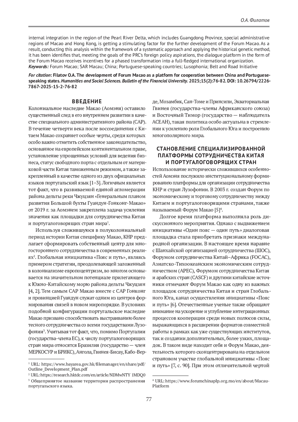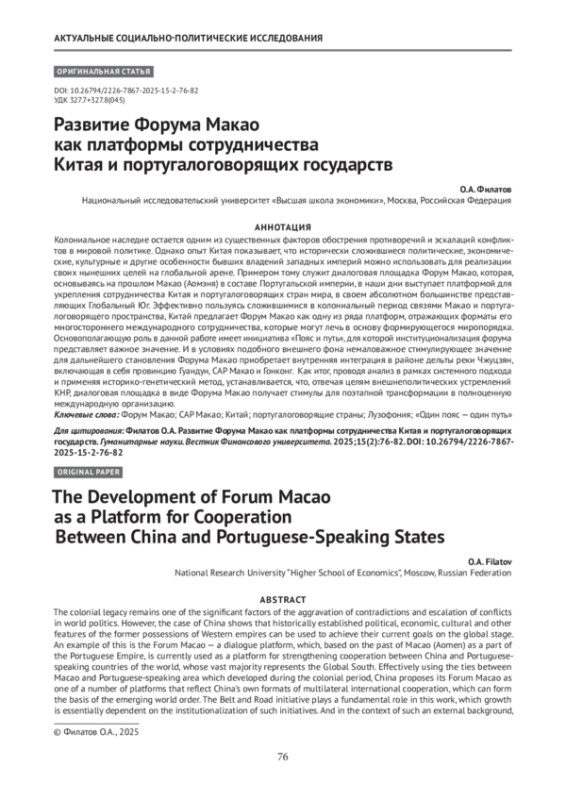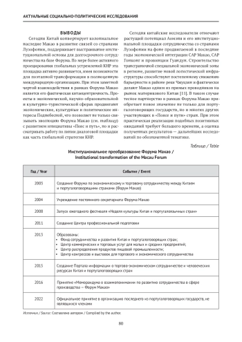 Колониальное наследие остается одним из существенных факторов обострения противоречий и эскалаций конфликтов в мировой политике. Однако опыт Китая показывает, что исторически сложившиеся политические, экономические, культурные и другие особенности бывших владений западных империй можно использовать для реализации своих нынешних целей на глобальной арене. Примером тому служит диалоговая площадка Форум Макао, которая, основываясь на прошлом Макао (Аомэня) в составе Португальской империи, в наши дни выступает платформой для укрепления сотрудничества Китая и португалоговорящих стран мира, в своем абсолютном большинстве представляющих Глобальный Юг. Эффективно пользуясь сложившимися в колониальный период связями Макао и португалоговорящего пространства, Китай предлагает Форум Макао как одну из ряда платформ, отражающих форматы его многостороннего международного сотрудничества, которые могут лечь в основу формирующегося миропорядка. Основополагающую роль в данной работе имеет инициатива «Пояс и путь», для которой институционализация форума представляет важное значение. И в условиях подобного внешнего фона немаловажное стимулирующее значение для дальнейшего становления Форума Макао приобретает внутренняя интеграция в районе дельты реки Чжуцзян, включающая в себя провинцию Гуандун, САР Макао и Гонконг. Как итог, проводя анализ в рамках системного подхода и применяя историко-генетический метод, устанавливается, что, отвечая целям внешнеполитических устремлений КНР, диалоговая площадка в виде Форума Макао получает стимулы для поэтапной трансформации в полноценную международную организацию.
