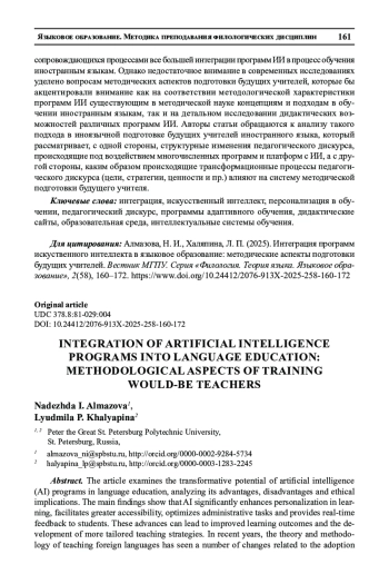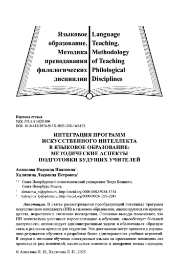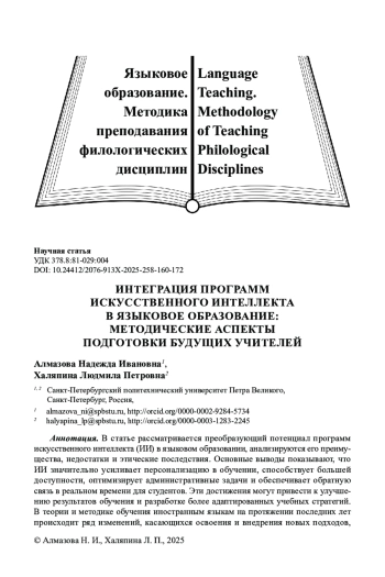 В статье рассматривается преобразующий потенциал программ искусственного интеллекта (ИИ) в языковом образовании, анализируются его преимущества, недостатки и этические последствия. Основные выводы показывают, что ИИ значительно усиливает персонализацию в обучении, способствует большей доступности, оптимизирует административные задачи и обеспечивает обратную связь в реальном времени для студентов. Эти достижения могут привести к улучшению результатов обучения и разработке более адаптированных учебных стратегий. В теории и методике обучения иностранным языкам на протяжении последних лет происходит ряд изменений, касающихся освоения и внедрения новых подходов, сопровождающихся процессами все большей интеграции программ ИИ в процесс обучения иностранным языкам. Однако недостаточное внимание в современных исследованиях уделено вопросам методических аспектов подготовки будущих учителей, которые бы акцентировали внимание как на соответствии методологической характеристики программ ИИ существующим в методической науке концепциям и подходам в обучении иностранным языкам, так и на детальном исследовании дидактических возможностей различных программ ИИ. Авторы статьи обращаются к анализу такого подхода в иноязычной подготовке будущих учителей иностранного языка, который рассматривает, с одной стороны, структурные изменения педагогического дискурса, происходящие под воздействием многочисленных программ и платформ с ИИ, а с другой стороны, каким образом происходящие трансформационные процессы педагогического дискурса (цели, стратегии, ценности и пр.) влияют на систему методической подготовки будущего учителя