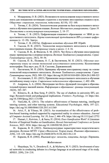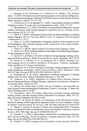 11. Евстигнеев, М. Н. (2024). Принципы обучения иностранному языку на основе технологий искусственного интеллекта. Вестник Тамбовского университета. Серия: Гуманитарные науки, 29(2). 309-323. DOI: 10.20310/1810-0201-2024-29-2-309-323 EDN: YGIPMO
