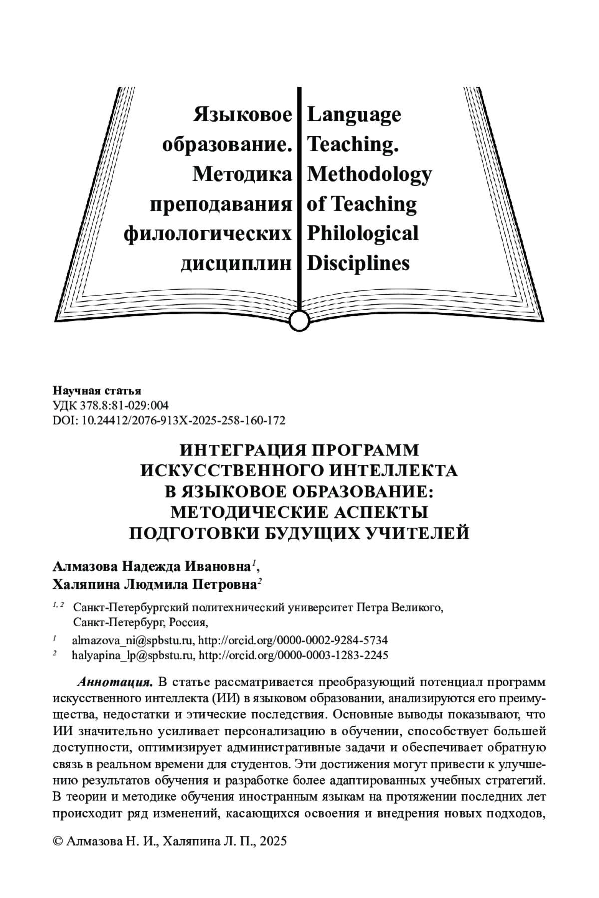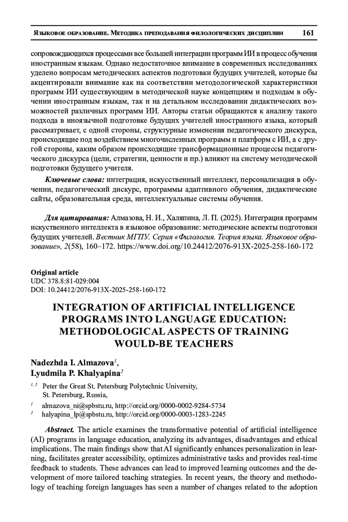 В фокусе внимания нашего исследования — методические аспекты интеграции ИИ в процесс подготовки будущих преподавателей иностранных языков (ИЯ). Актуальность данной темы определяется конкретизацией тех задач, которые выявлены в ходе работы на протяжении нескольких лет со студентами-магистрантами международной образовательной программы подготовки преподавателей ИЯ в рамках дисциплины «Теории и методика преподавания ИЯ» в Санкт-Петербургском политехническом университете.