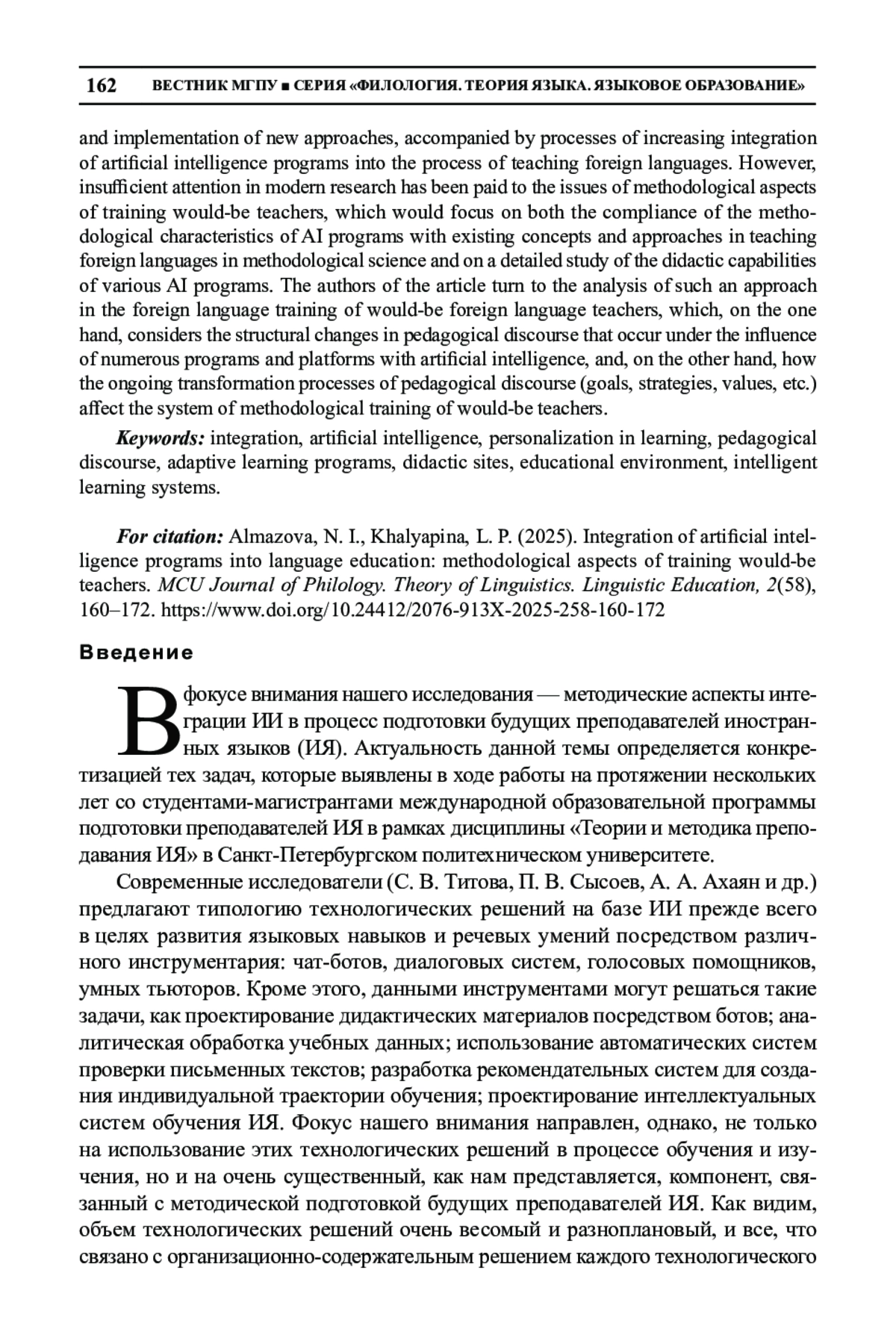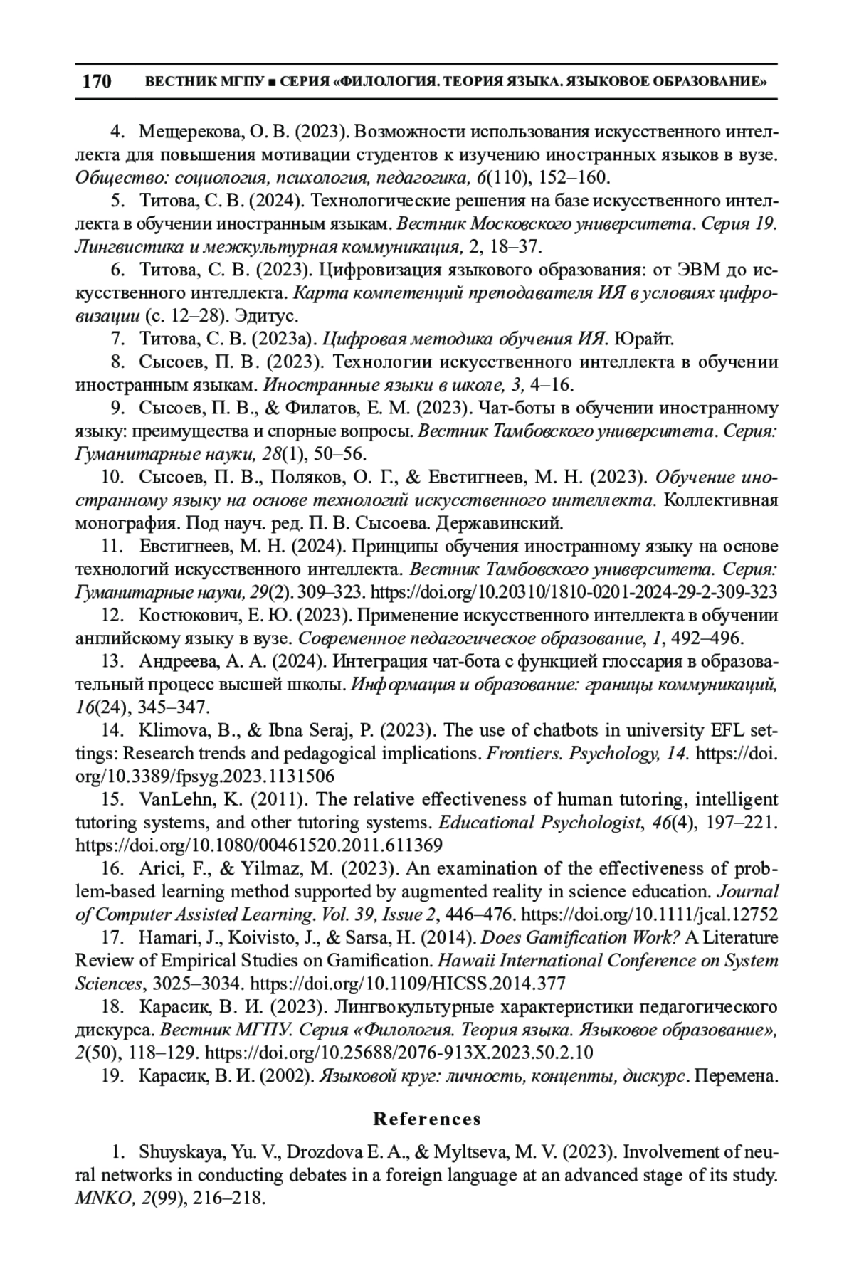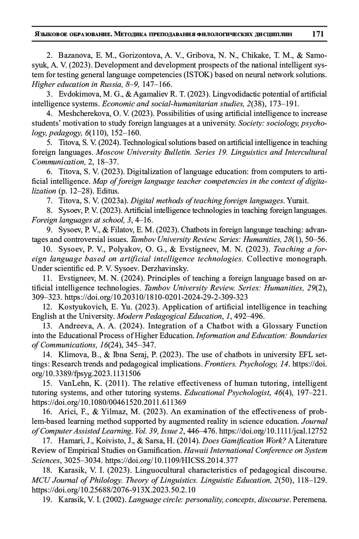 5. Титова, С. В. (2024). Технологические решения на базе искусственного интеллекта в обучении иностранным языкам. Вестник Московского университета. Серия 19. Лингвистика и межкультурная коммуникация, 2, 18-37. EDN: OWSQVG