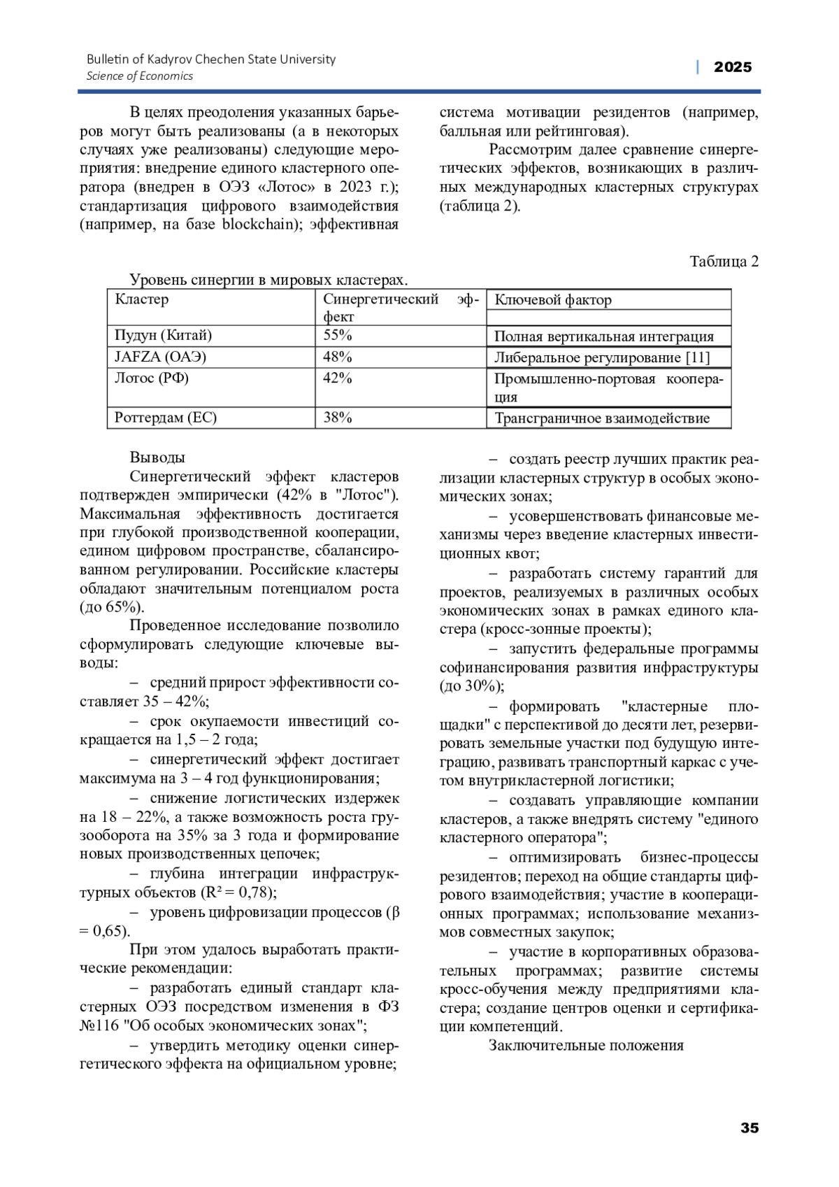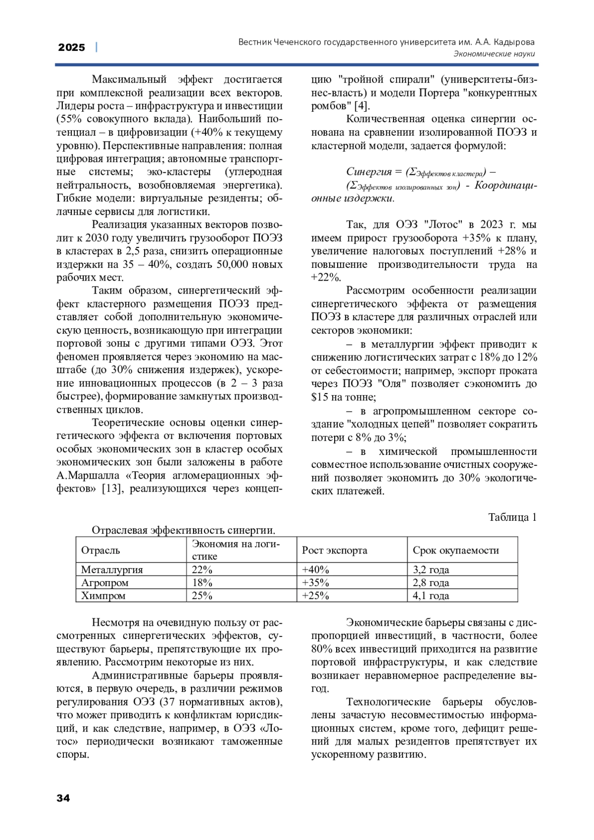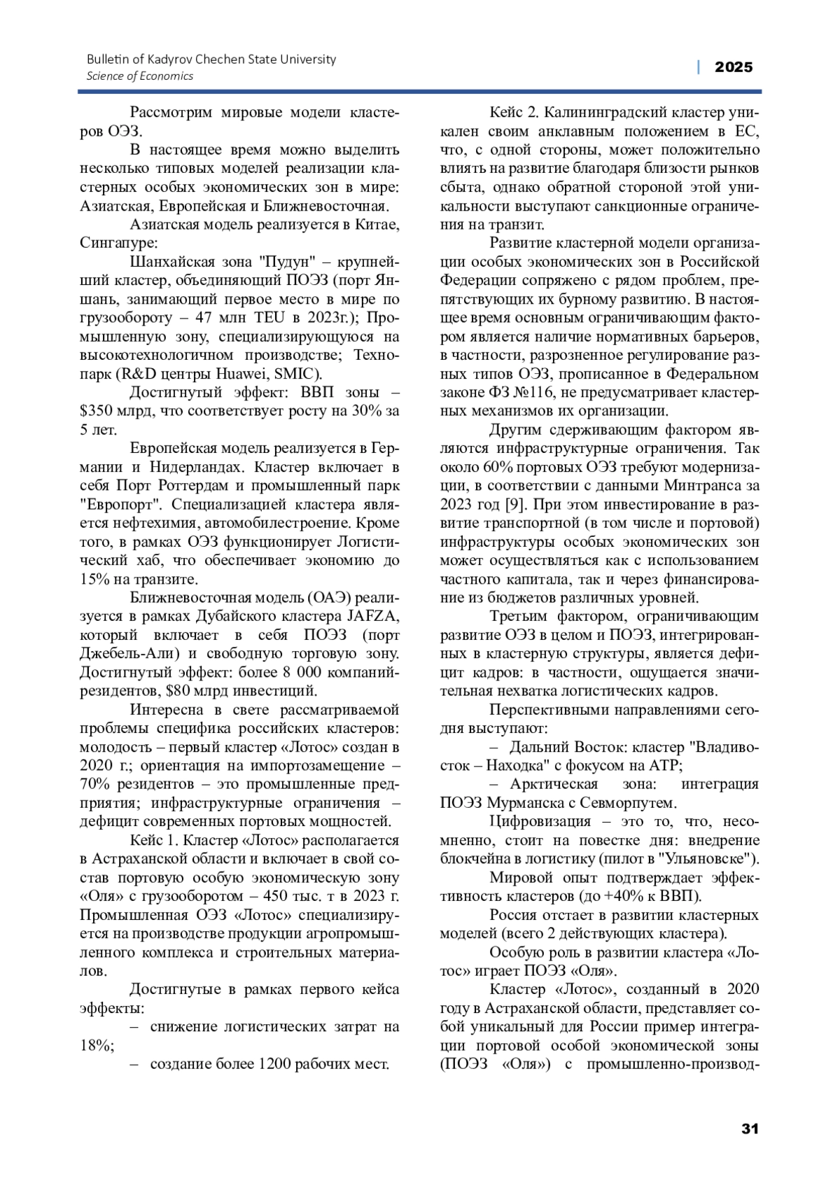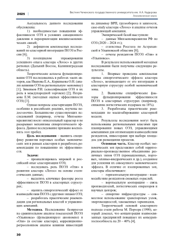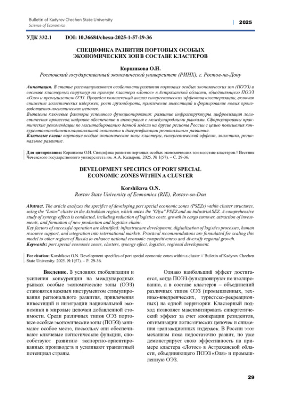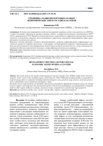 В статье рассматриваются особенности развития портовых особых экономических зон (ПОЭЗ) в составе кластерных структур на примере кластера «Лотос» в Астраханской области, объединяющего ПОЭЗ «Оля» и промышленную ОЭЗ. Проведен комплексный анализ синергетических эффектов кластеризации, включая снижение логистических издержек, рост грузооборота, привлечение инвестиций и формирование новых производственно-логистических цепочек. Выявлены ключевые факторы успешного функционирования: развитие инфраструктуры, цифровизация логистических процессов, кадровое обеспечение и интеграция с международными рынками. Сформулированы практические рекомендации по масштабированию данной модели на другие регионы России с целью повышения конкурентоспособности национальной экономики и диверсификации регионального развития.