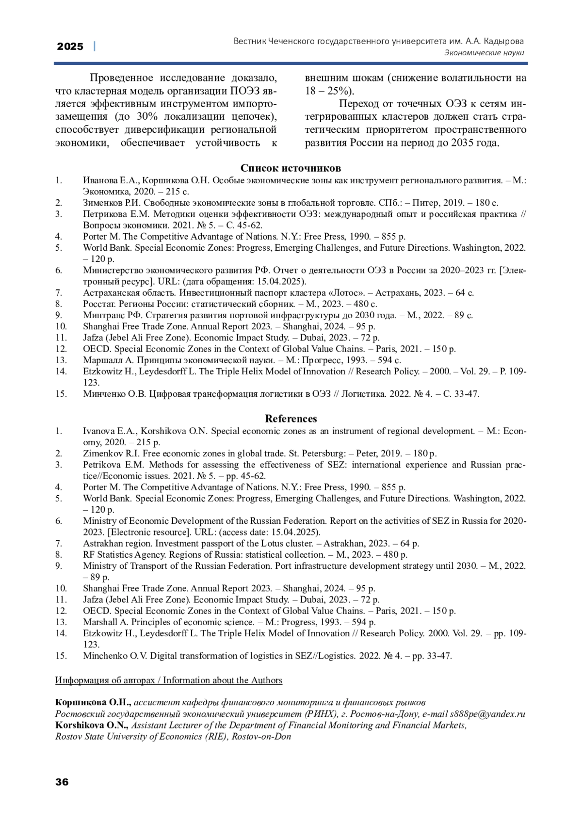 1. Иванова Е.А., Коршикова О.Н. Особые экономические зоны как инструмент регионального развития. - М.: Экономика, 2020. - 215 с.