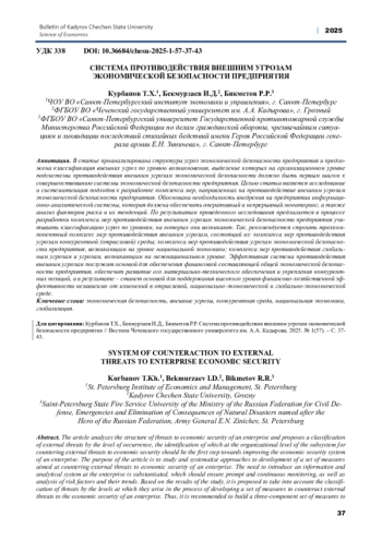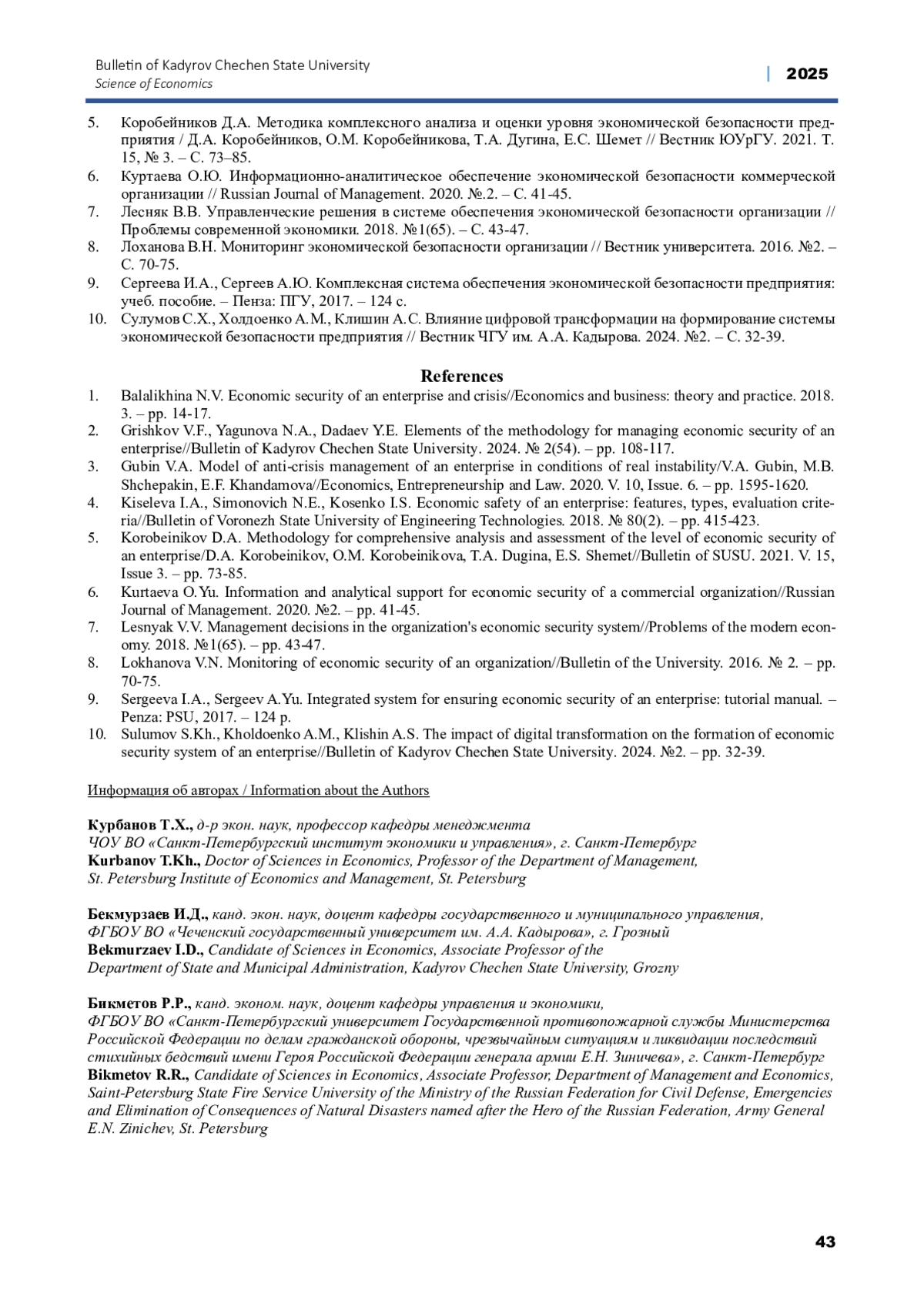 10. Сулумов С.Х., Холдоенко А.М., Клишин А.С. Влияние цифровой трансформации на формирование системы экономической безопасности предприятия // Вестник ЧГУ им. А.А. Кадырова. 2024. №2. - С. 32-39.