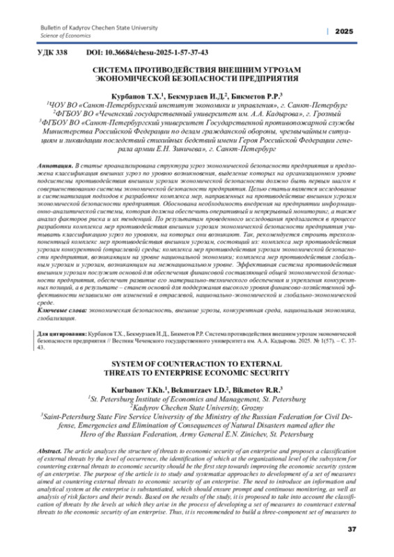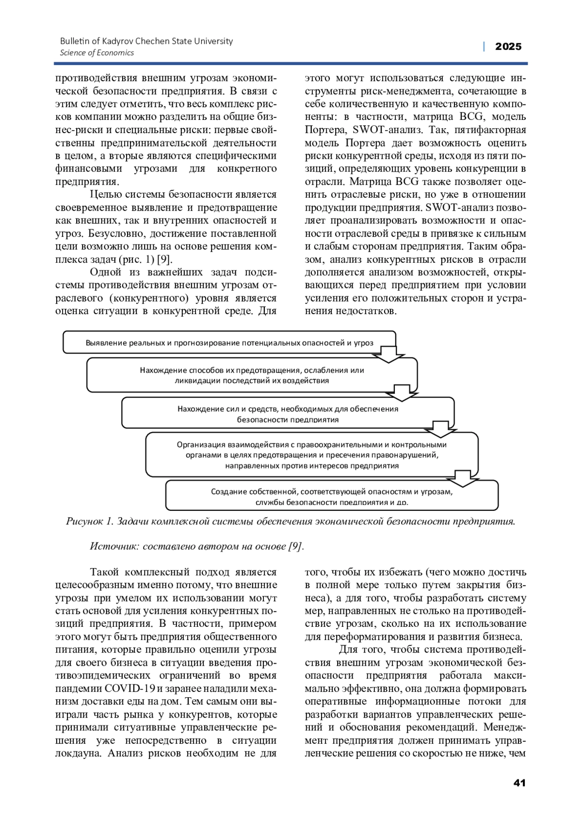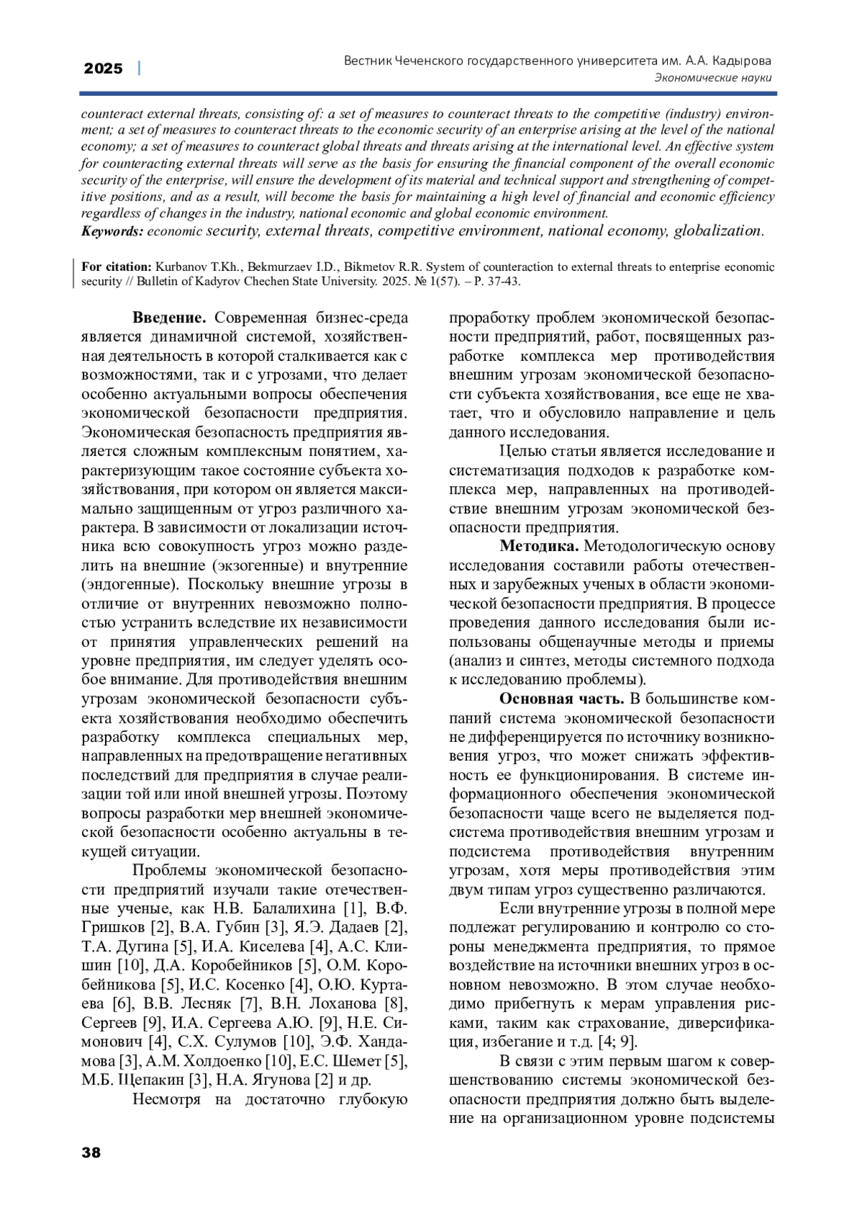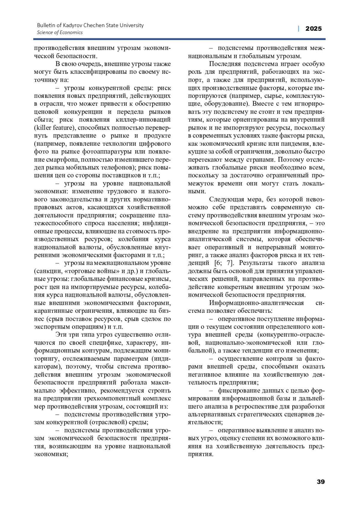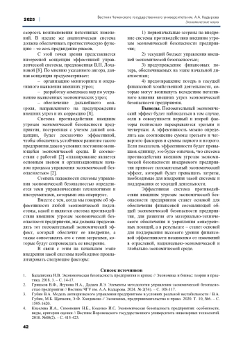 2. Гришков В.Ф., Ягунова Н.А., Дадаев Я.Э. Элементы методологии управления экономической безопасностью предприятия // Вестник ЧГУ им. А.А. Кадырова. 2024. № 2(54). - С. 108-117. EDN: OJWXPH