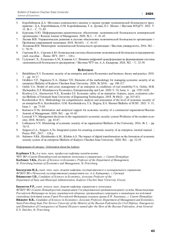 5. Коробейников Д.А. Методика комплексного анализа и оценки уровня экономической безопасности предприятия / Д.А. Коробейников, О.М. Коробейникова, Т.А. Дугина, Е.С. Шемет // Вестник ЮУрГУ. 2021. Т. 15, № 3. - С. 73-85. EDN: CHBQIW