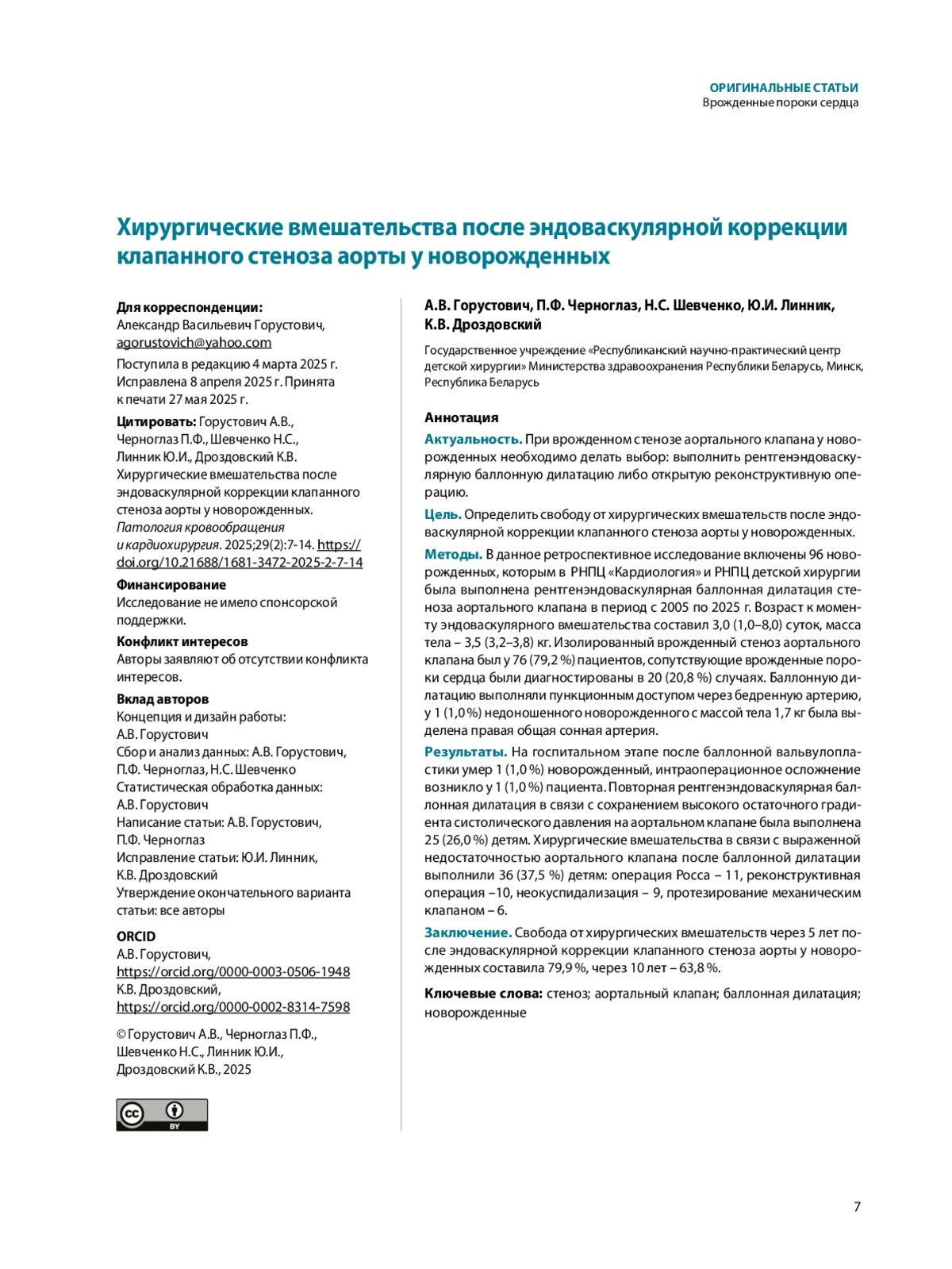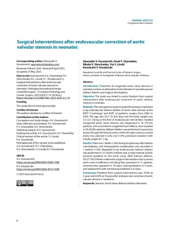 В настоящее время в кардиохирургии актуальной проблемой является коррекция врожденного стеноза аортального клапана (АК) у детей. При этом критические аортальные стенозы проявляются в периоде новорожденности. В данных ситуациях необходимо делать выбор: выполнить рентгенэндоваскулярную баллонную дилатацию (РЭБД) либо открытую операцию на АК [1; 2]. Оба метода имеют как преимущества, так и недостатки. Во многих кардиохирургических центрах баллонную вальвулопластику выполняют как первый этап коррекции врожденного стеноза АК у детей [3–6]. В других клиниках выполняют открытые операции на АК в качестве альтернативы эндоваскулярным вмешательствам [7–10]. Для того чтобы определиться с методом выбора коррекции стеноза АК у новорожденных, необходимо изучить результаты различных способов.