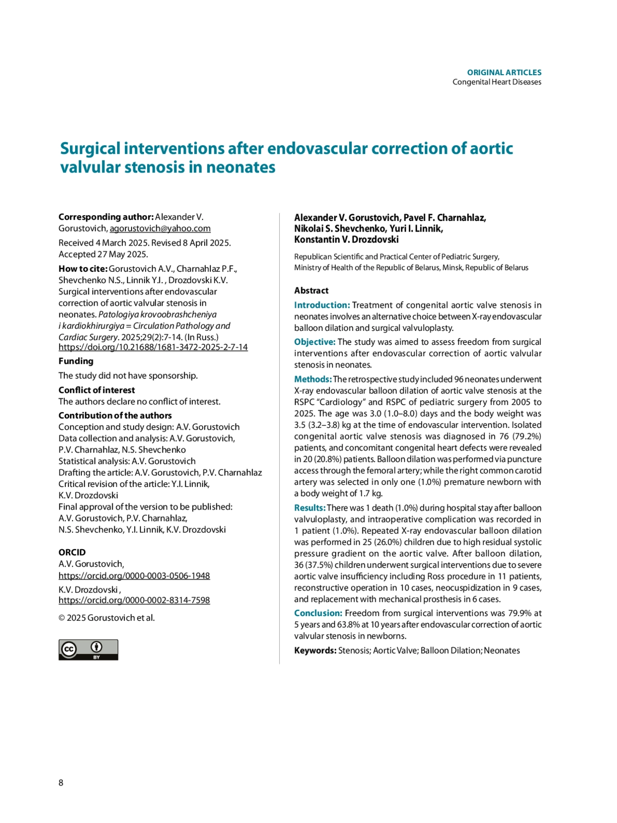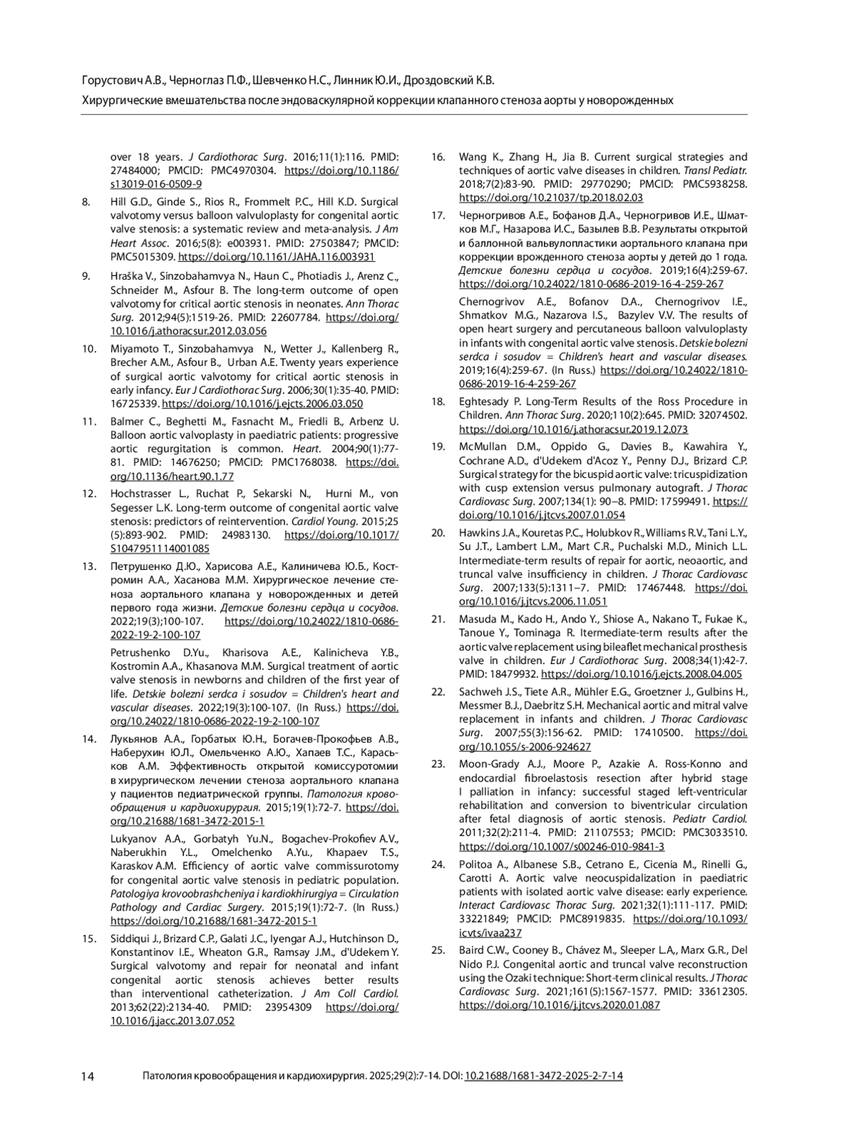 1. Donald J.S., Konstantinov I.E. Surgical aortic valvuloplasty versus balloon aortic valve dilatation in children. World J Pediatr Congenit Heart Surg. 2016;7(5):583-91. PMID: 27587493. DOI: 10.1177/2150135116651091 PMID: 27587493