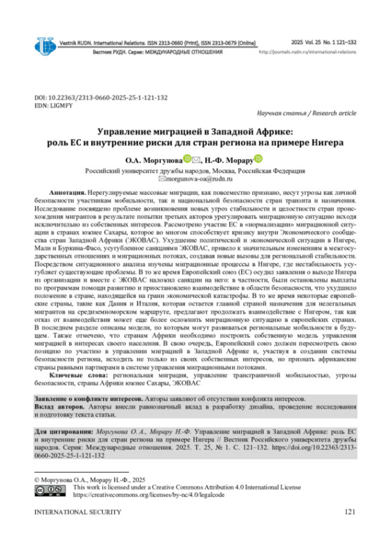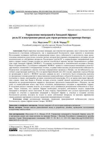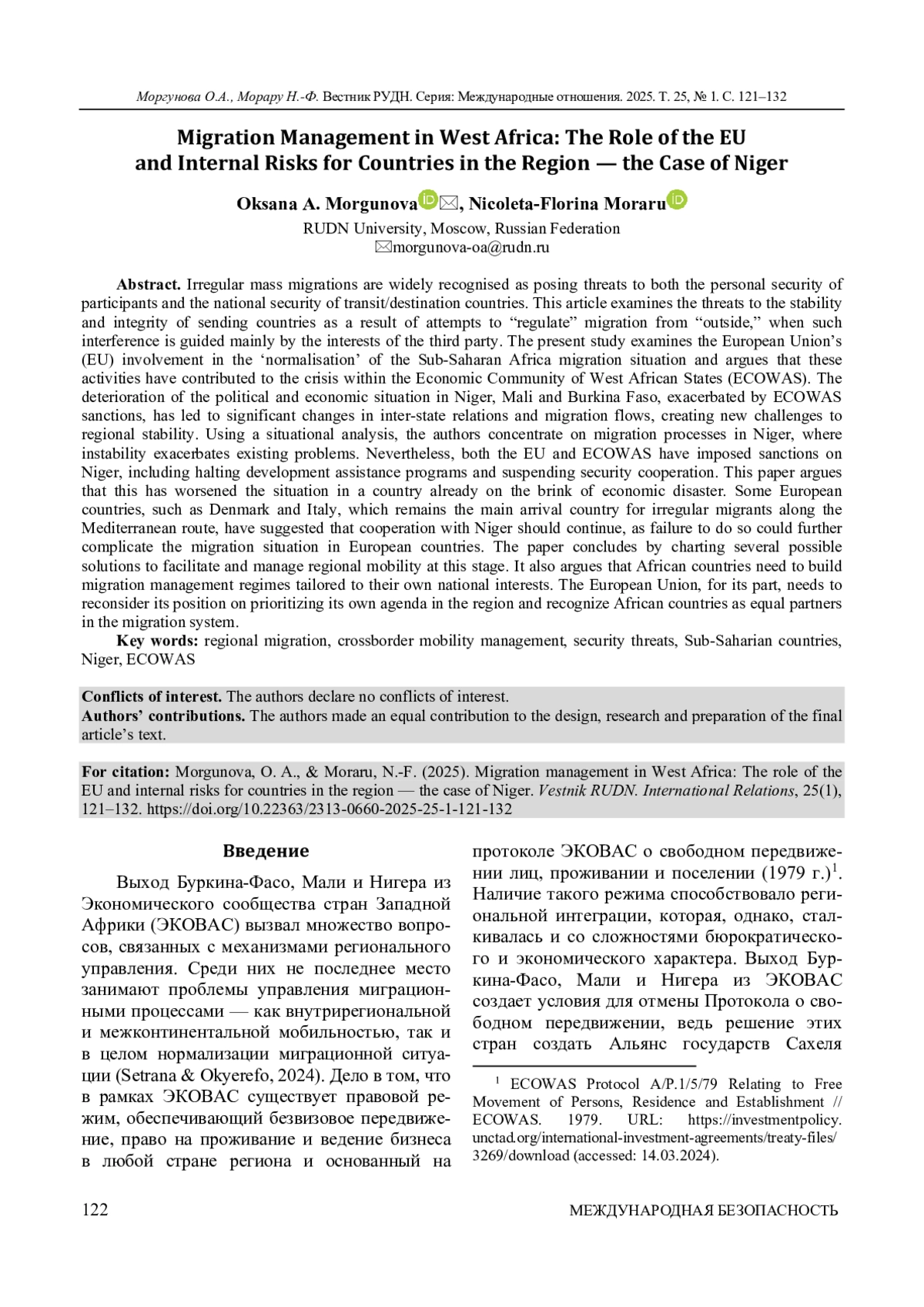 Нерегулируемые массовые миграции, как повсеместно признано, несут угрозы как личной безопасности участникам мобильности, так и национальной безопасности стран транзита и назначения. Исследование посвящено проблеме возникновения новых угроз стабильности и целостности стран происхождения мигрантов в результате попытки третьих акторов урегулировать миграционную ситуацию исходя исключительно из собственных интересов. Рассмотрено участие ЕС в «нормализации» миграционной ситуации в странах южнее Сахары, которое во многом способствует кризису внутри Экономического сообщества стран Западной Африки (ЭКОВАС). Ухудшение политической и экономической ситуации в Нигере, Мали и Буркина-Фасо, усугубленное санкциями ЭКОВАС, привело к значительным изменениям в межгосударственных отношениях и миграционных потоках, создавая новые вызовы для региональной стабильности. Посредством ситуационного анализа изучены миграционные процессы в Нигере, где нестабильность усугубляет существующие проблемы. В то же время Европейский союз (ЕС) осудил заявления о выходе Нигера из организации и вместе с ЭКОВАС наложил санкции на него: в частности, были остановлены выплаты по программам помощи развитию и приостановлено взаимодействие в области безопасности, что ухудшило положение в стране, находящейся на грани экономической катастрофы. В то же время некоторые европейские страны, такие как Дания и Италия, которая остается главной страной назначения для нелегальных мигрантов на средиземноморском маршруте, предлагают продолжать взаимодействие с Нигером, так как отказ от взаимодействия может еще более осложнить миграционную ситуацию в европейских странах. В последнем разделе описаны модели, по которым могут развиваться региональные мобильности в будущем. Также отмечено, что странам Африки необходимо построить собственную модель управления миграцией в интересах своего населения. В свою очередь, Европейский союз должен пересмотреть свою позицию по участию в управлении миграцией в Западной Африке и, участвуя в создании системы безопасности региона, исходить не только из своих собственных интересов, но признать африканские страны равными партнерами в системе управления миграционными потоками.