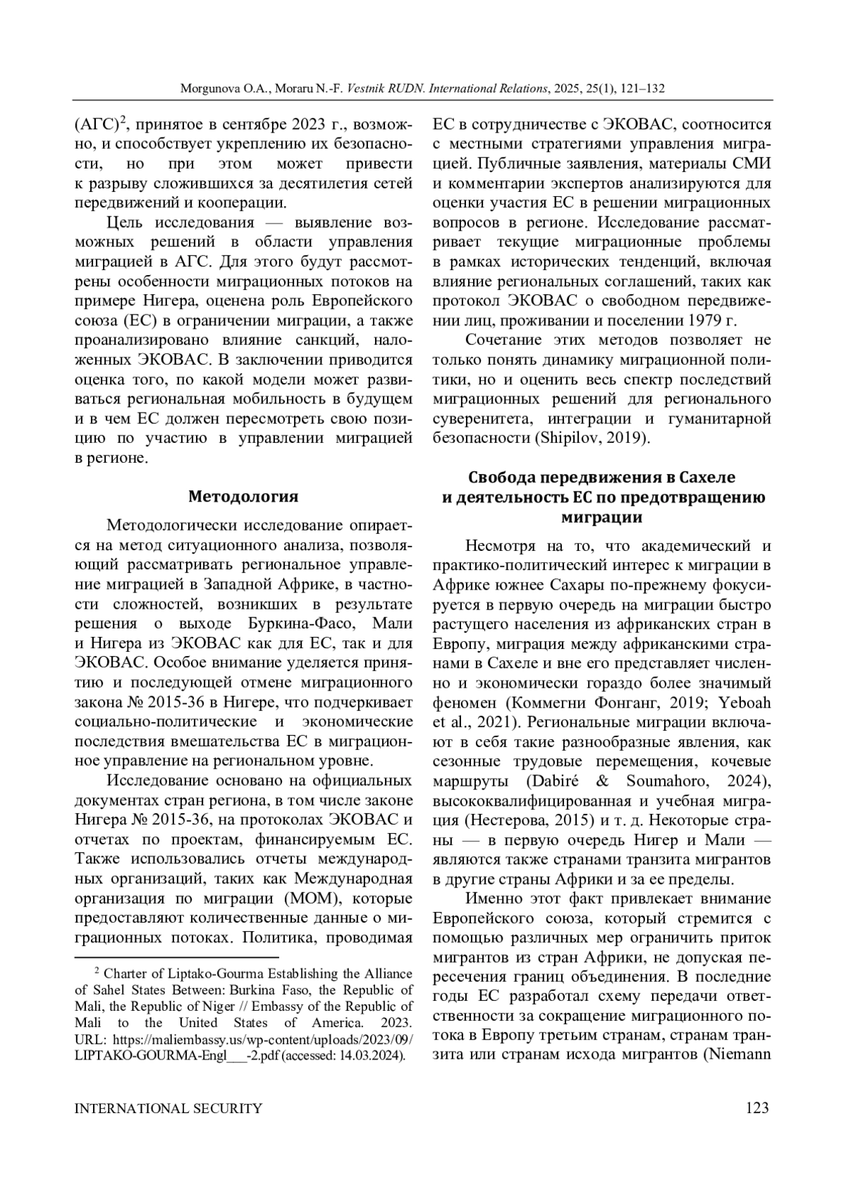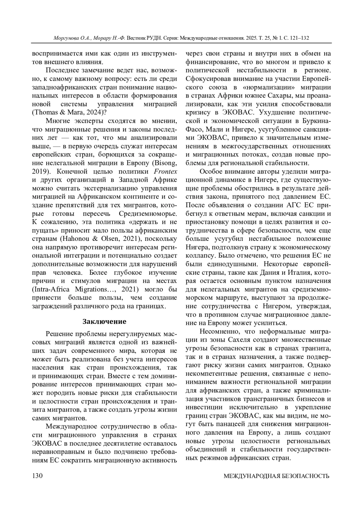 2. Захаров И. А., Агафошин М. М., Горохов С. А. Миграционный кризис в Западной Африке: ограничения и перспективы политического регулирования // Вестник Российского университета дружбы народов. Серия: Международные отношения. 2024. Т. 24, № 4. C. 616-627. ;. DOI: 10.22363/2313-0660-2024-24-4-616-627 EDN: MFEMEG