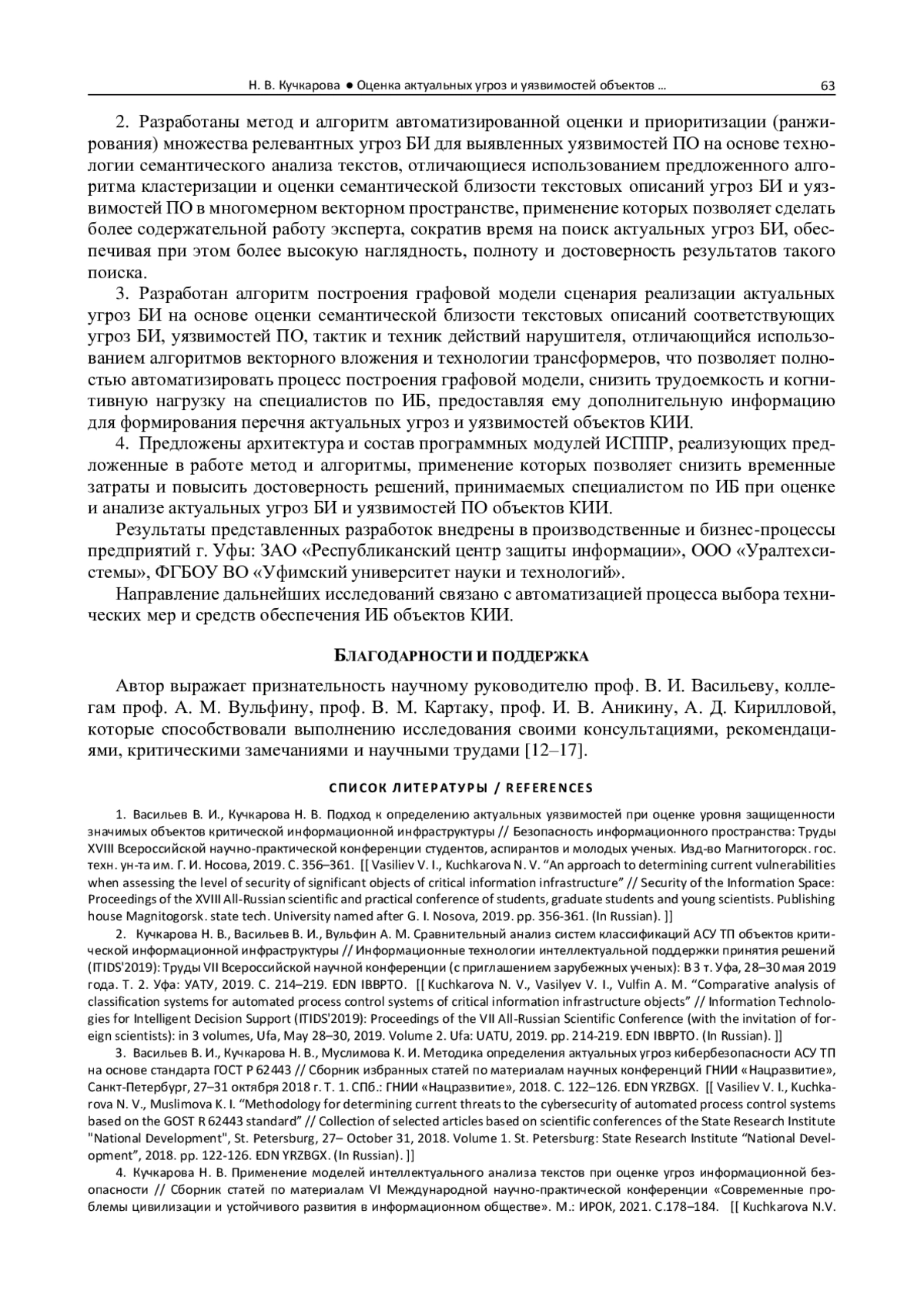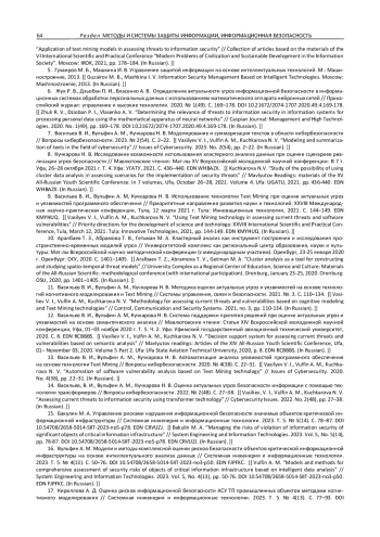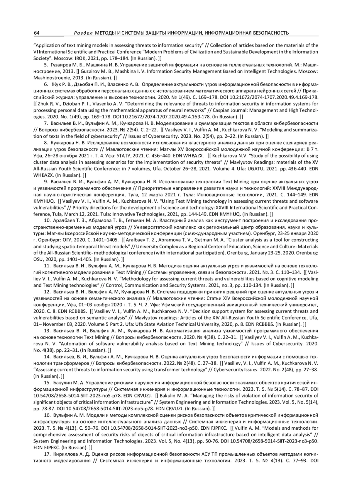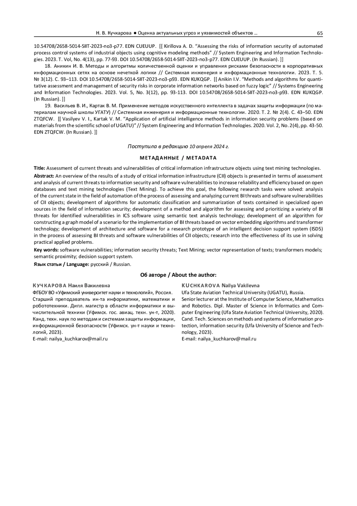 КУЧКАРОВА Н. В. ОЦЕНКА АКТУАЛЬНЫХ УГРОЗ И УЯЗВИМОСТЕЙ ОБЪЕКТОВ КРИТИЧЕСКОЙ ИНФОРМАЦИОННОЙ ИНФРАСТРУКТУРЫ С ИСПОЛЬЗОВАНИЕМ ТЕХНОЛОГИЙ ИНТЕЛЛЕКТУАЛЬНОГО АНАЛИЗА ТЕКСТОВ // СИСТЕМНАЯ ИНЖЕНЕРИЯ И ИНФОРМАЦИОННЫЕ ТЕХНОЛОГИИ. 2024. ТОМ 6, № 2(17)