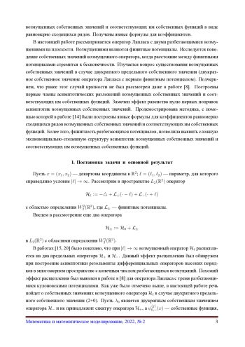 23. Борисов Д.И., Коныркулжаева М.Н. О бесконечной системе резонансов и собственных значений с экспоненциальными асимптотиками, порожденных разбегающимися возмущениями // Уфимский математический журнал. 2020. Т. 12. № 4. С. 3-19. EDN: PZNNPJ