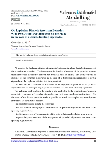 21. Головина А.М. О спектре периодических операторов с разбегающимися возмущениями // Математика и математическое моделирование. МГТУ им. Н.Э. Баумана. Электрон. журн. 2017. № 2. С. 1-24. DOI: 10.24108/mathm.0217.0000063 EDN: ZMQLPZ