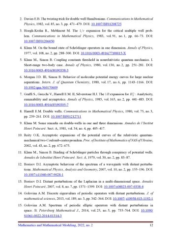 12. Borisov D.I. Asymptotic behaviour of the spectrum of a waveguide with distant perturbations // Mathematical Physics, Analysis and Geometry. 2007. Vol. 10. No. 2. Pp. 155-196. DOI: 10.1007/s11040-007-9028-1 EDN: LKHVVJ