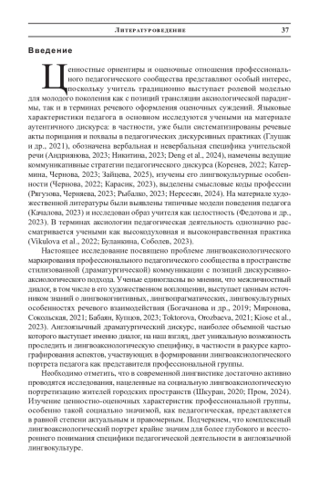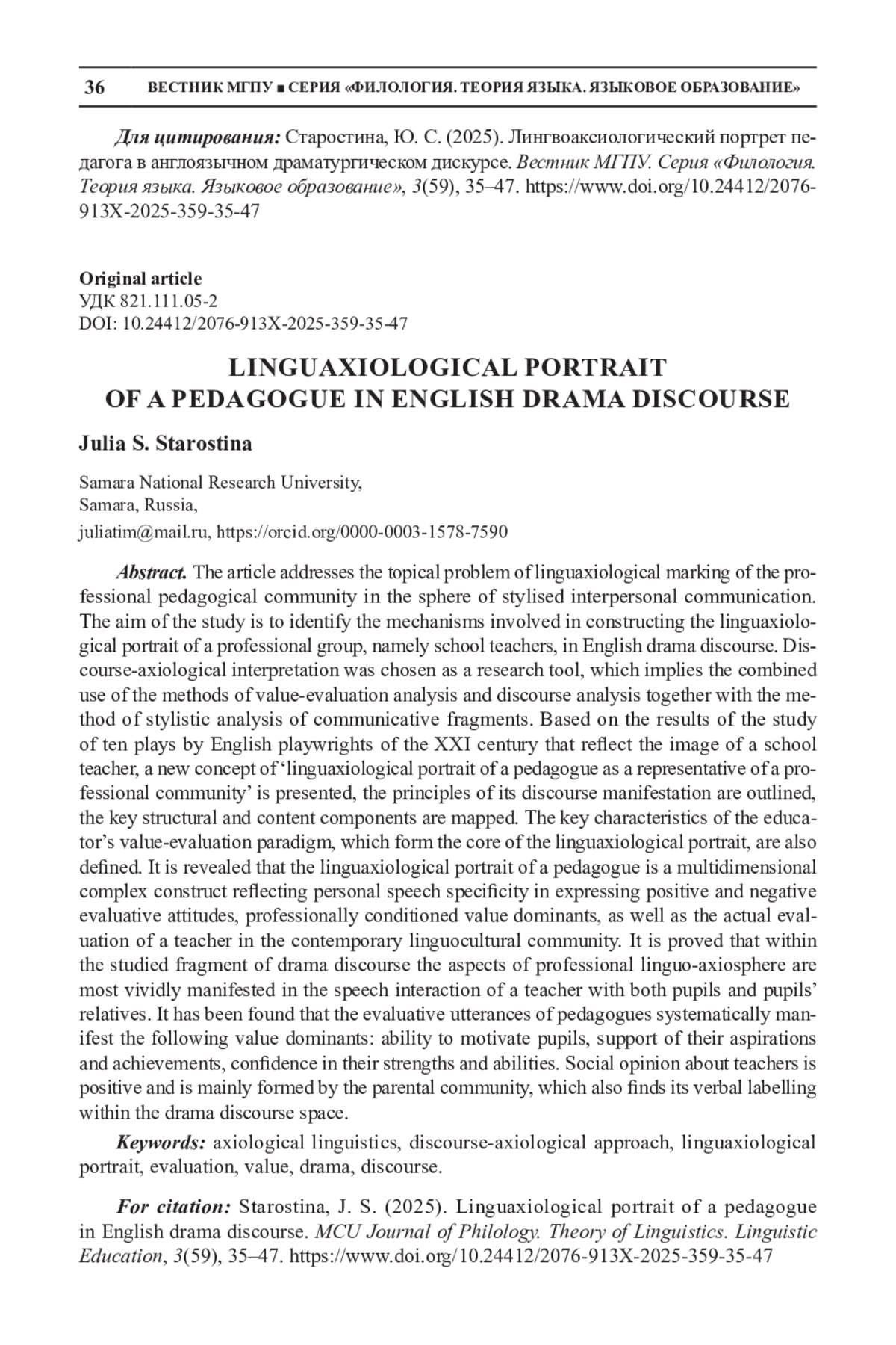 Статья посвящена актуальной проблеме лингвоаксиологического маркирования профессионального педагогического сообщества в сфере стилизованного межличностного общения. Цель исследования - выявление механизмов конструирования лингвоаксиологического портрета профессиональной группы, а именно школьных педагогов, в англоязычном драматургическом дискурсе. В качестве исследовательского инструмента была избрана дискурсивно-аксиологическая интерпретация, подразумевающая совокупное использование методов ценностно-оценочного анализа и дискурс-анализа с привлечением метода стилистического анализа коммуникативных фрагментов. По результатам исследования десяти произведений англоязычной драматургии XXI века, в которых находит отражение образ школьного учителя, представлено новое понятие «лингвоаксиологический портрет педагога как представителя профессионального сообщества», намечены принципы его дискурсивной манифестации, картографированы структурные и содержательные компоненты. Определены ключевые характеристики ценностно-оценочной парадигмы педагога, формирующие лингвоаксиологический портрет. Выявлено, что лингвоаксиологический портрет педагога представляет собой многомерный комплексный конструкт, отражающий личностную речевую специфику при выражении позитивных и негативных оценочных отношений, профессионально обусловленные ценностные доминанты, а также актуальную оценку педагога в современном лингвокультурном сообществе. Доказано, что в исследованном фрагменте драматургического дискурса наиболее ярко аспекты профессиональной лингвоаксиосферы проявляются при речевом взаимодействии педагога как с учениками, так и с родственниками учеников. Зафиксировано, что оценочные высказывания персонажей-педагогов системно транслируют следующие ценностные доминанты: мотивирование учеников, поддержку их стремлений и достижений, уверенность в их силах и способностях. Социальное мнение о педагогах имеет позитивную направленность и формируется в основном родительской общественностью, что также находит вербальное маркирование в пределах драматургического дискурсивного пространства.