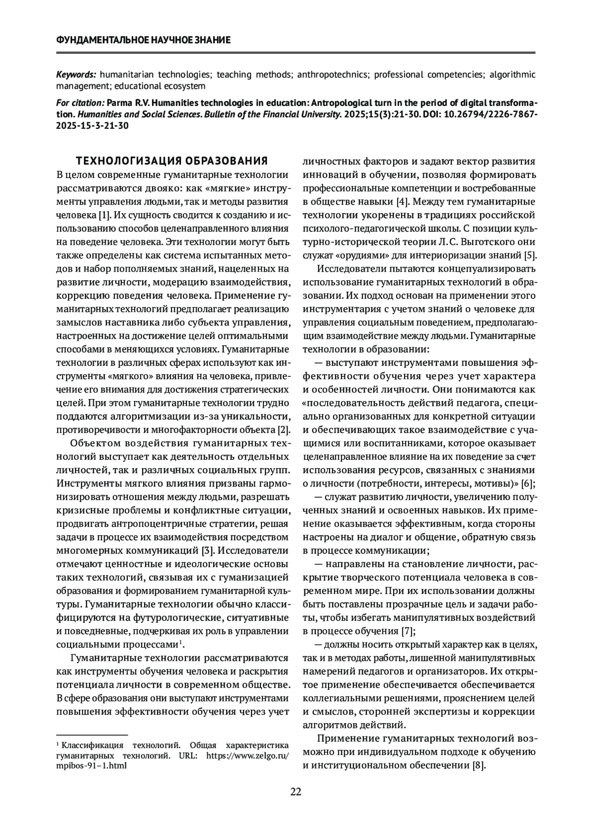 В статье раскрываются общие представления о содержании и функциях гуманитарных технологий в образовании, которые могут быть направлены как на применение методов развития человека, так и на внедрение способов управления его поведением. Предлагается авторская концептуализация гуманитарных технологий в образовательной сфере, выделяются ключевые характеристики данной категории на современном этапе. Исходя из обзора научных публикаций автор выделяет приемы обучения для достижения поставленной цели и техники воздействия для совершения нужных действий. Статья исследует переход гуманитарных технологий в образовании от традиционных методов к цифровым инструментам антропоцентрических практик. В статье также предлагается сравнительный анализ традиционных средств обучения и новых образовательных практик, внедряемых на основе гуманитарных технологий, преимущественно цифровой природы. Автор отмечает, что гуманитарные технологии преодолевают технократическую парадигму, формируя «экосистемы соразвития», где технологии активируют приращение человеческого потенциала. В статье предложены ключевые направления развития концепции гуманитарных технологий в сфере образования, содержащиеся в современном академическом дискурсе.