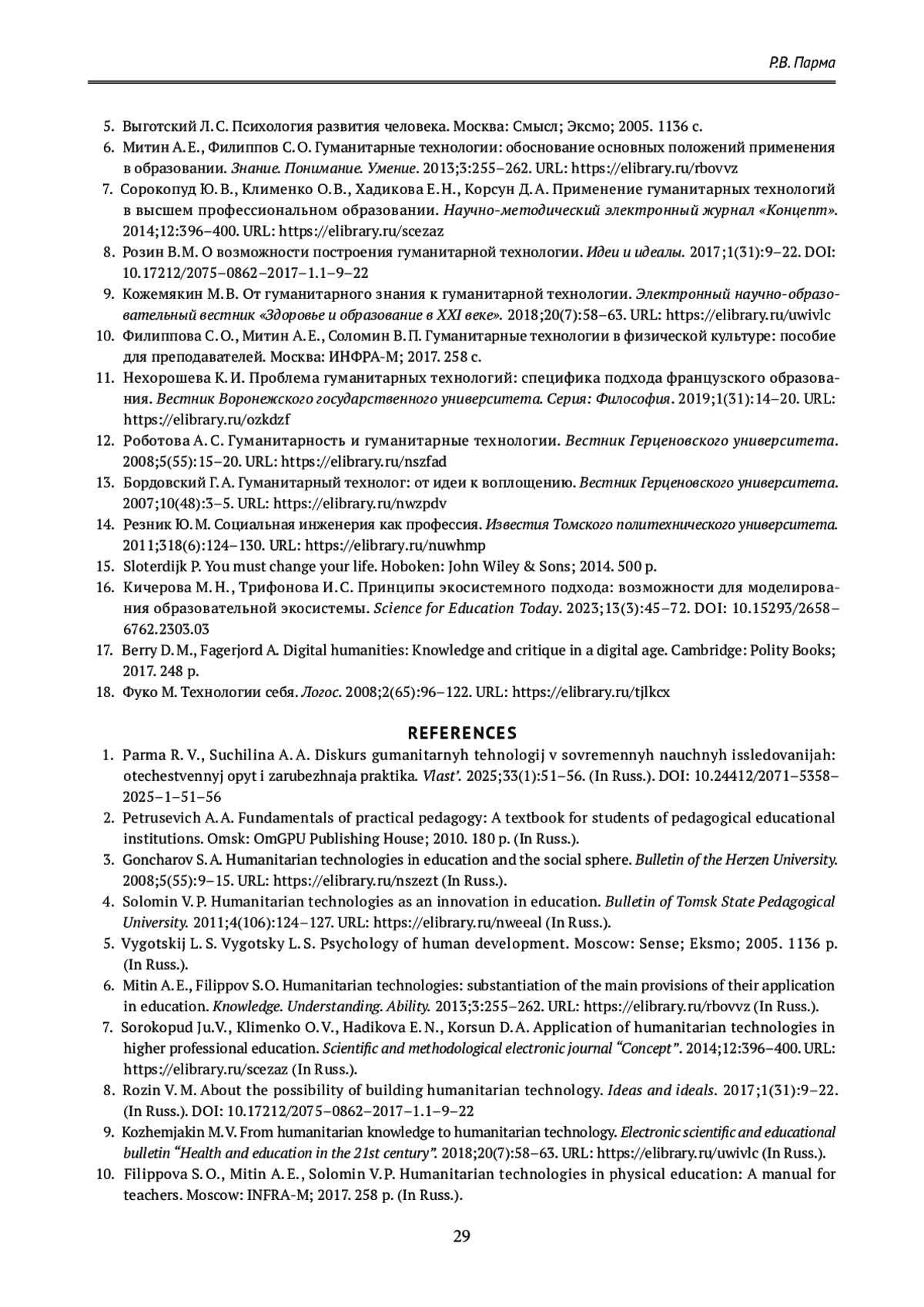 1. Парма Р. В., Сучилина А. А. Дискурс гуманитарных технологий в современных научных исследованиях: отечественный опыт и зарубежная практика. Власть. 2025;33(1):51-56. https://doi.org/10.24412/2071-5358-2025-1-51-56