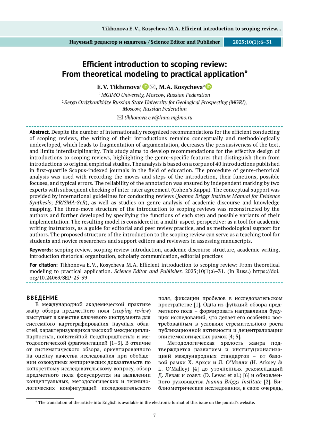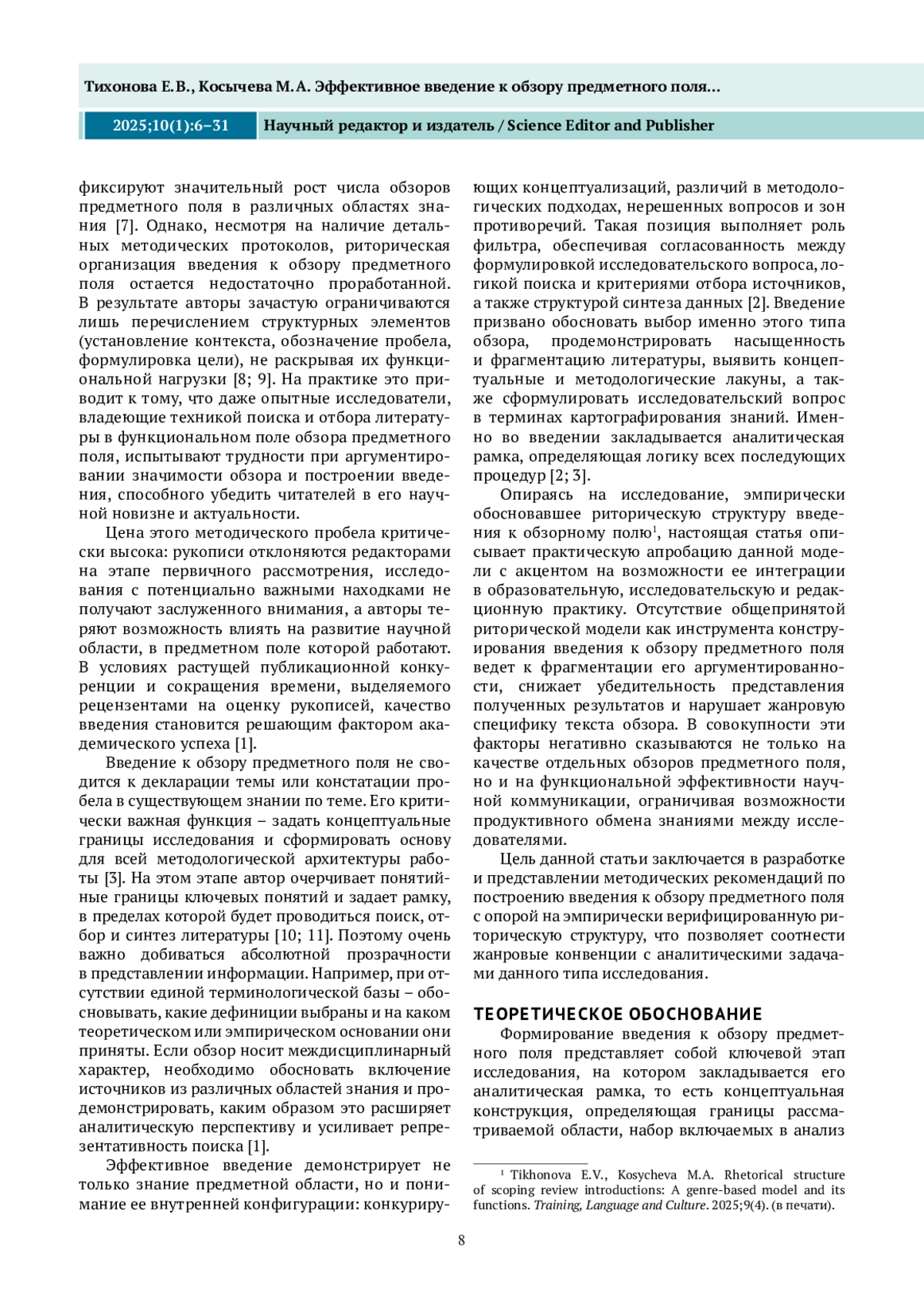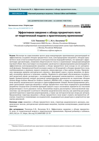 ТИХОНОВА Е. В., КОСЫЧЕВА М. А. ЭФФЕКТИВНОЕ ВВЕДЕНИЕ К ОБЗОРУ ПРЕДМЕТНОГО ПОЛЯ: ОТ ТЕОРЕТИЧЕСКОЙ МОДЕЛИ К ПРАКТИЧЕСКОМУ ПРИМЕНЕНИЮ* // НАУЧНЫЙ РЕДАКТОР И ИЗДАТЕЛЬ. 2025. № 1, ТОМ 10