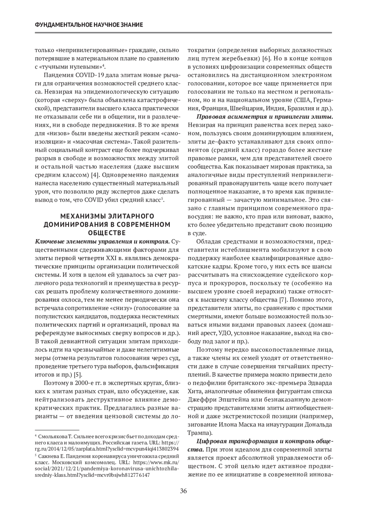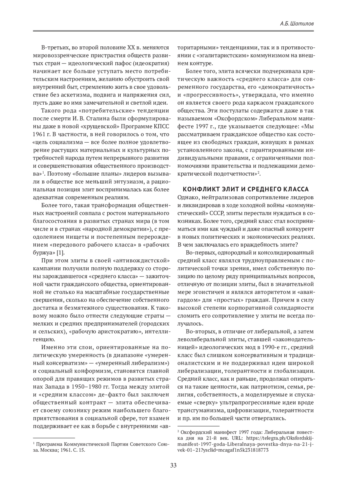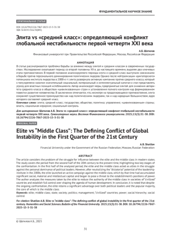 В статье рассматривается проблема борьбы за влияние между элитой и средним классом в современных государствах. Исследование охватывает период со второй половины XX в. до настоящего времени, выделяя два ключевых этапа противостояния. В первой половине анализируемого периода элита и средний класс выступали союзниками в борьбе против персонального доминирования политических лидеров. Однако после нейтрализации «диктаторского» потенциала института лидерства в 2000-е гг. элита развернула активную кампанию против среднего класса, который к тому времени накопил значительный социальный, материальный и интеллектуальный капитал и стал представлять угрозу для властных позиций истеблишмента. Автор анализирует меры, предпринятые элитой для снижения авторитета среднего класса в обществах «цивилизованных» стран и установления полного контроля над формированием повестки развития человечества. В заключении отмечается, что, несмотря на продолжающееся противостояние, элита сохраняет существенное преимущество как над политическими лидерами, так и над народным большинством, ядро которого составляет средний класс.