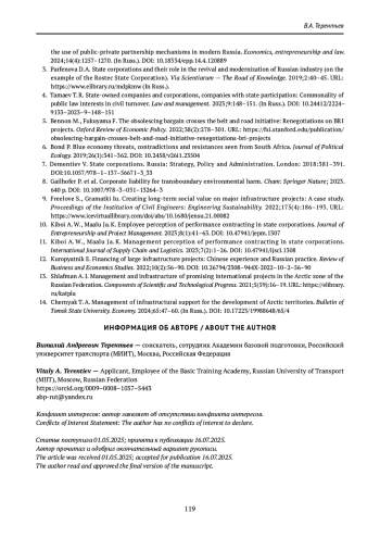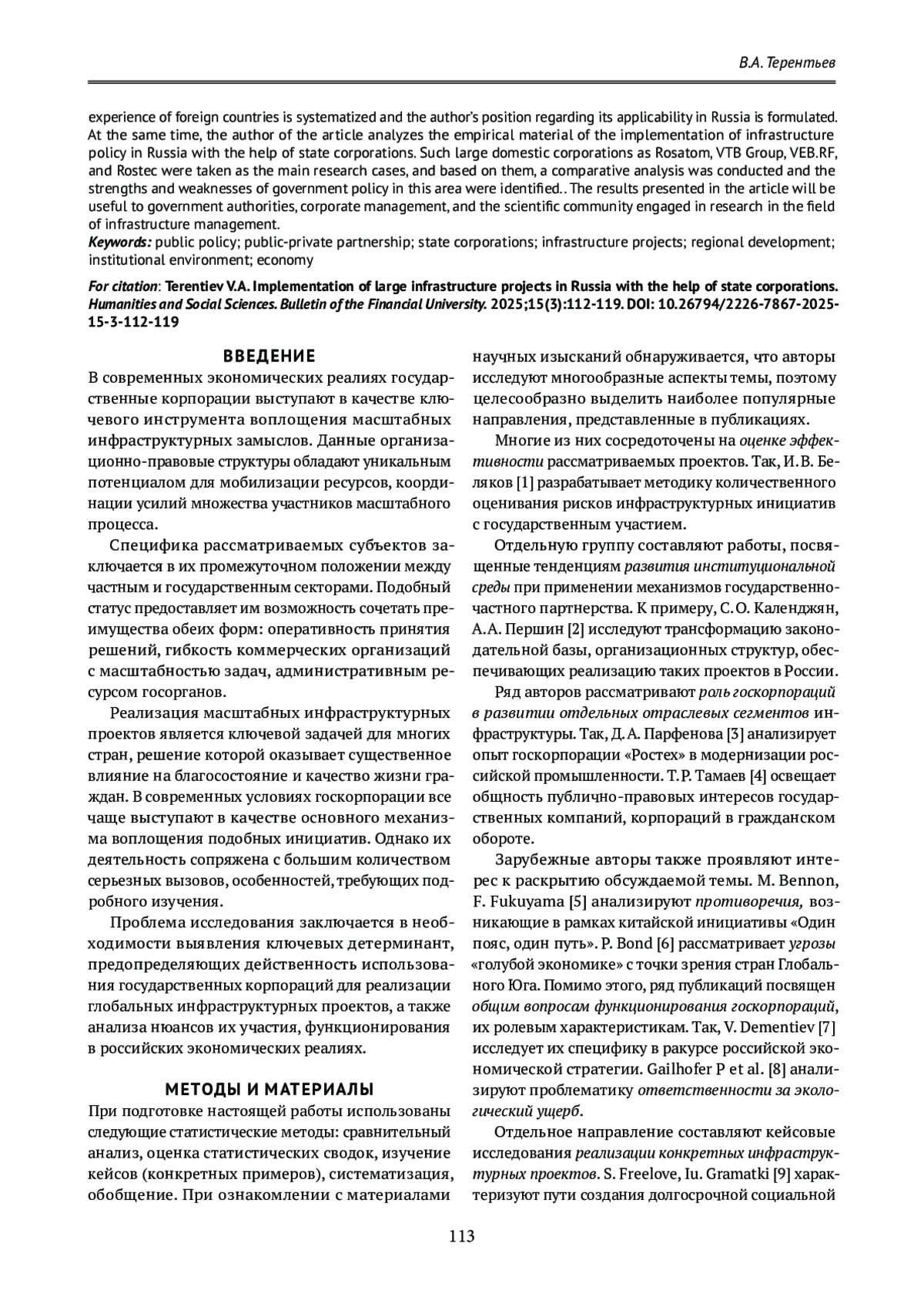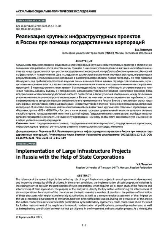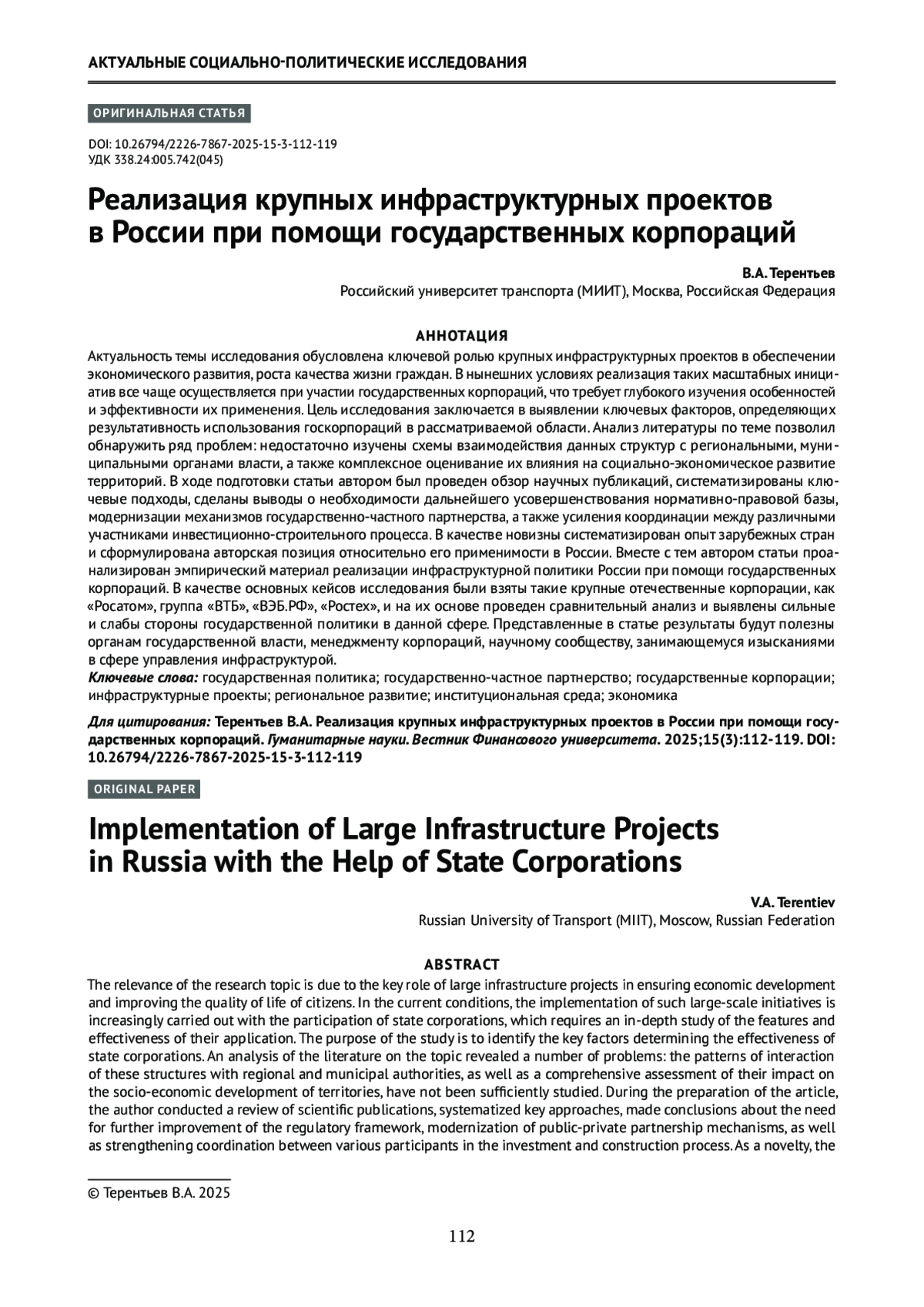 ТЕРЕНТЬЕВ В. А. РЕАЛИЗАЦИЯ КРУПНЫХ ИНФРАСТРУКТУРНЫХ ПРОЕКТОВ В РОССИИ ПРИ ПОМОЩИ ГОСУДАРСТВЕННЫХ КОРПОРАЦИЙ // ГУМАНИТАРНЫЕ НАУКИ. ВЕСТНИК ФИНАНСОВОГО УНИВЕРСИТЕТА. 2025. ТОМ 15, № 3