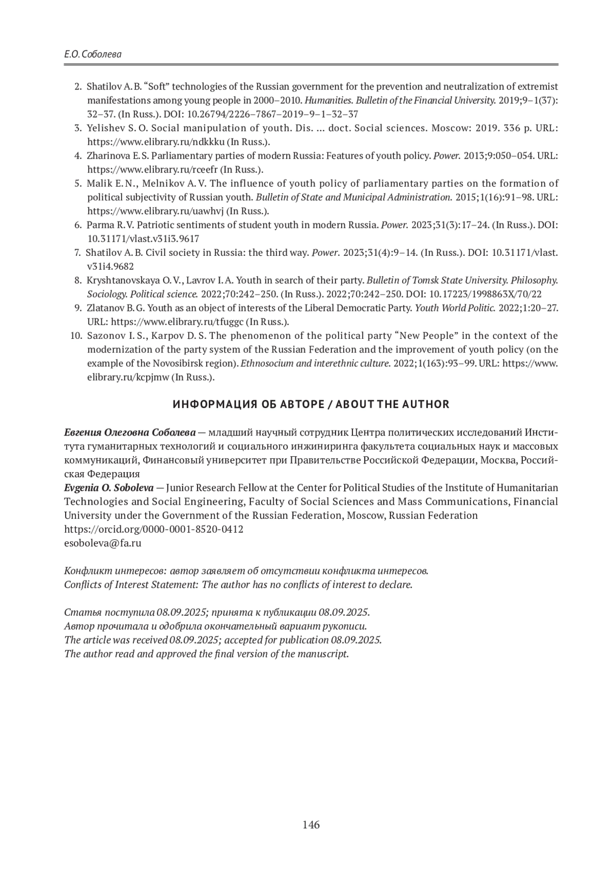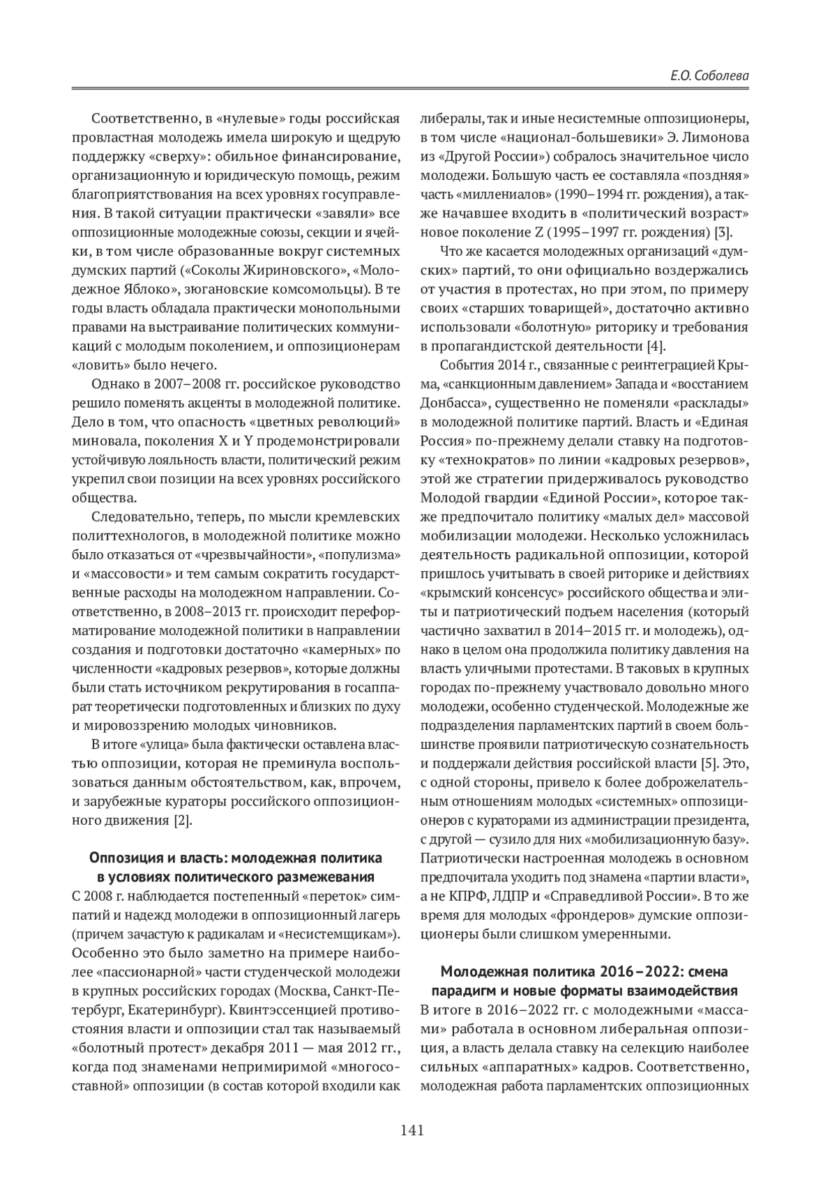 1. Михеева В. В. Оппозиционные политические молодежные объединения в России: современная история. Genesis: исторические исследования. 2023;3:24-25. https://doi.org/10.25136/2409-868X.2023.3.39919