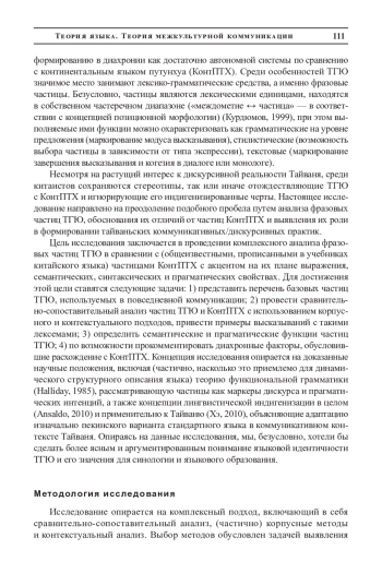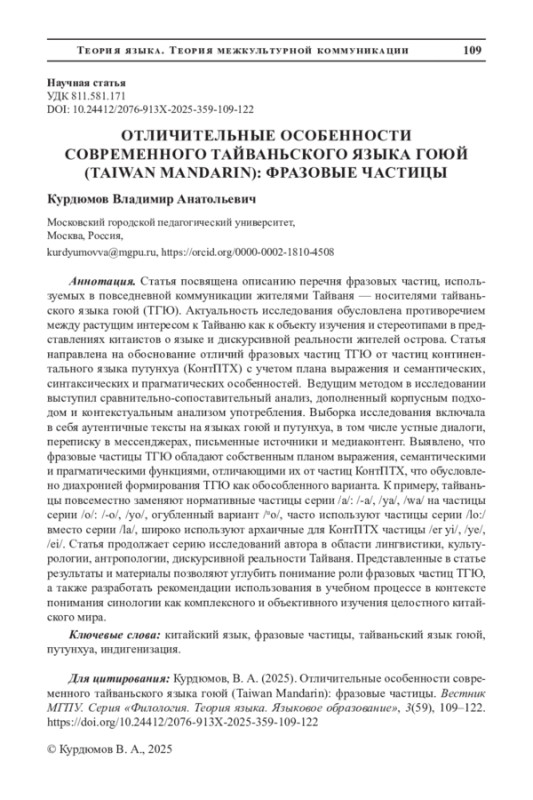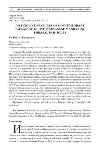 Статья посвящена описанию перечня фразовых частиц, используемых в повседневной коммуникации жителями Тайваня - носителями тайваньского языка гоюй (ТГЮ). Актуальность исследования обусловлена противоречием между растущим интересом к Тайваню как к объекту изучения и стереотипами в представлениях китаистов о языке и дискурсивной реальности жителей острова. Статья направлена на обоснование отличий фразовых частиц ТГЮ от частиц континентального языка путунхуа (КонтПТХ) с учетом плана выражения и семантических, синтаксических и прагматических особенностей. Ведущим методом в исследовании выступил сравнительно-сопоставительный анализ, дополненный корпусным подходом и контекстуальным анализом употребления. Выборка исследования включала в себя аутентичные тексты на языках гоюй и путунхуа, в том числе устные диалоги, переписку в мессенджерах, письменные источники и медиаконтент. Выявлено, что фразовые частицы ТГЮ обладают собственным планом выражения, семантическими и прагматическими функциями, отличающими их от частиц КонтПТХ, что обусловлено диахронией формирования ТГЮ как обособленного варианта. К примеру, тайваньцы повсеместно заменяют нормативные частицы серии /а/: /-а/, /ya/, /wa/ на частицы серии /o/: /-o/, /yo/, огубленный вариант ©о/, часто используют частицы серии /lo:/ вместо серии Да/, широко используют архаичные для КонтПТХ частицы /er yi/, /ye/, /ei/. Статья продолжает серию исследований автора в области лингвистики, культурологии, антропологии, дискурсивной реальности Тайваня. Представленные в статье результаты и материалы позволяют углубить понимание роли фразовых частиц ТГЮ, а также разработать рекомендации использования в учебном процессе в контексте понимания синологии как комплексного и объективного изучения целостного китайского мира.