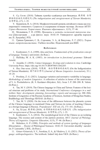 6. Тан, М. В. (2019). Китайский язык в Китае и на Тайване: Особенности лексического строя и проблемы его изучения. Международная конференция “Языки в полиэтническом государстве: развитие, планирование, прогнозирование”: доклады и сообщения (с. 200-204). Институт языкознания РАН, Институт монголоведения, буддологии и тибетологии СО РАН.