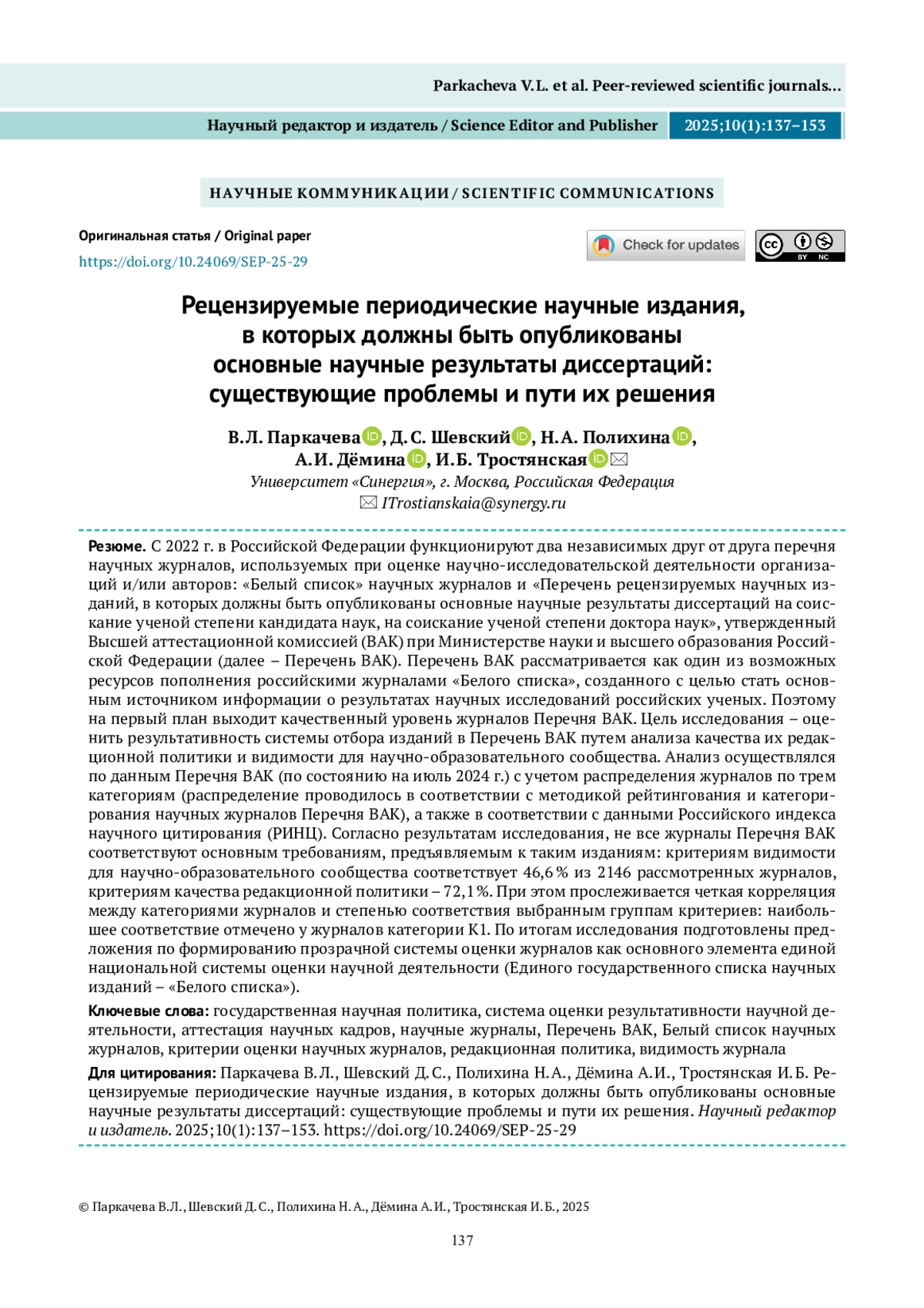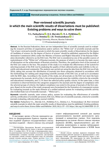 С 2022 г. в Российской Федерации функционируют два независимых друг от друга перечня научных журналов, используемых при оценке научно-исследовательской деятельности организаций и/или авторов: «Белый список» научных журналов и «Перечень рецензируемых научных изданий, в которых должны быть опубликованы основные научные результаты диссертаций на соискание ученой степени кандидата наук, на соискание ученой степени доктора наук», утвержденный Высшей аттестационной комиссией (ВАК) при Министерстве науки и высшего образования Российской Федерации (далее – Перечень ВАК). Перечень ВАК рассматривается как один из возможных ресурсов пополнения российскими журналами «Белого списка», созданного с целью стать основным источником информации о результатах научных исследований российских ученых. Поэтому на первый план выходит качественный уровень журналов Перечня ВАК. Цель исследования – оценить результативность системы отбора изданий в Перечень ВАК путем анализа качества их редакционной политики и видимости для научно-образовательного сообщества. Анализ осуществлялся по данным Перечня ВАК (по состоянию на июль 2024 г.) с учетом распределения журналов по трем категориям (распределение проводилось в соответствии с методикой рейтингования и категорирования научных журналов Перечня ВАК), а также в соответствии с данными Российского индекса научного цитирования (РИНЦ). Согласно результатам исследования, не все журналы Перечня ВАК соответствуют основным требованиям, предъявляемым к таким изданиям: критериям видимости для научно-образовательного сообщества соответствует 46,6 % из 2146 рассмотренных журналов, критериям качества редакционной политики – 72,1 %. При этом прослеживается четкая корреляция между категориями журналов и степенью соответствия выбранным группам критериев: наибольшее соответствие отмечено у журналов категории К1. По итогам исследования подготовлены предложения по формированию прозрачной системы оценки журналов как основного элемента единой национальной системы оценки научной деятельности (Единого государственного списка научных изданий – «Белого списка»).