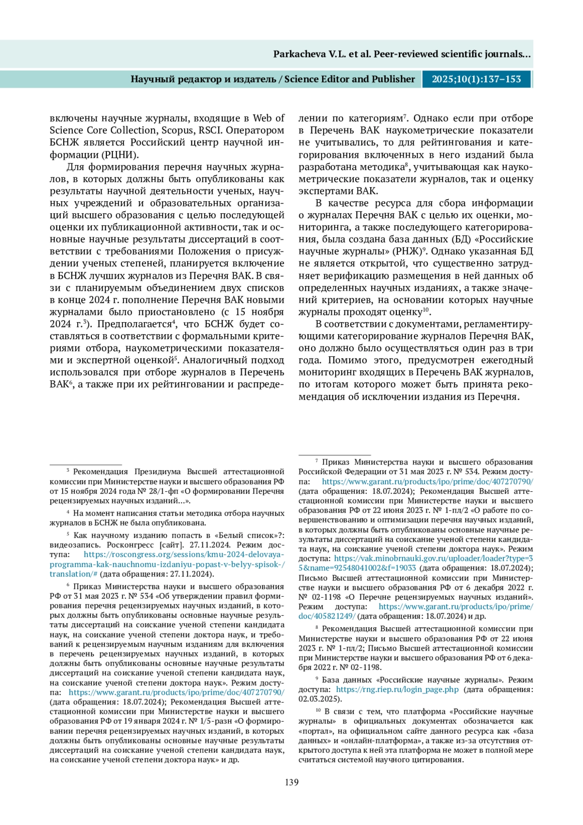 1. Кириллова О. В. Об изменениях в государственной научно-публикационной политике, “Белом списке” и перспективах развития российских научных журналов. Научный редактор и издатель. 2024;9(2):124-133. DOI: 10.24069/SEP-24-22