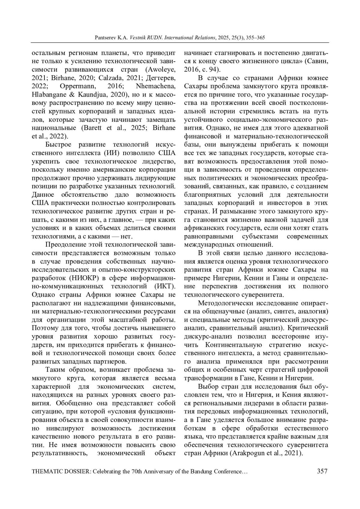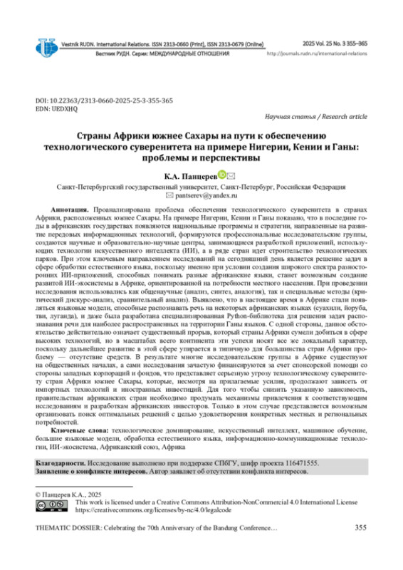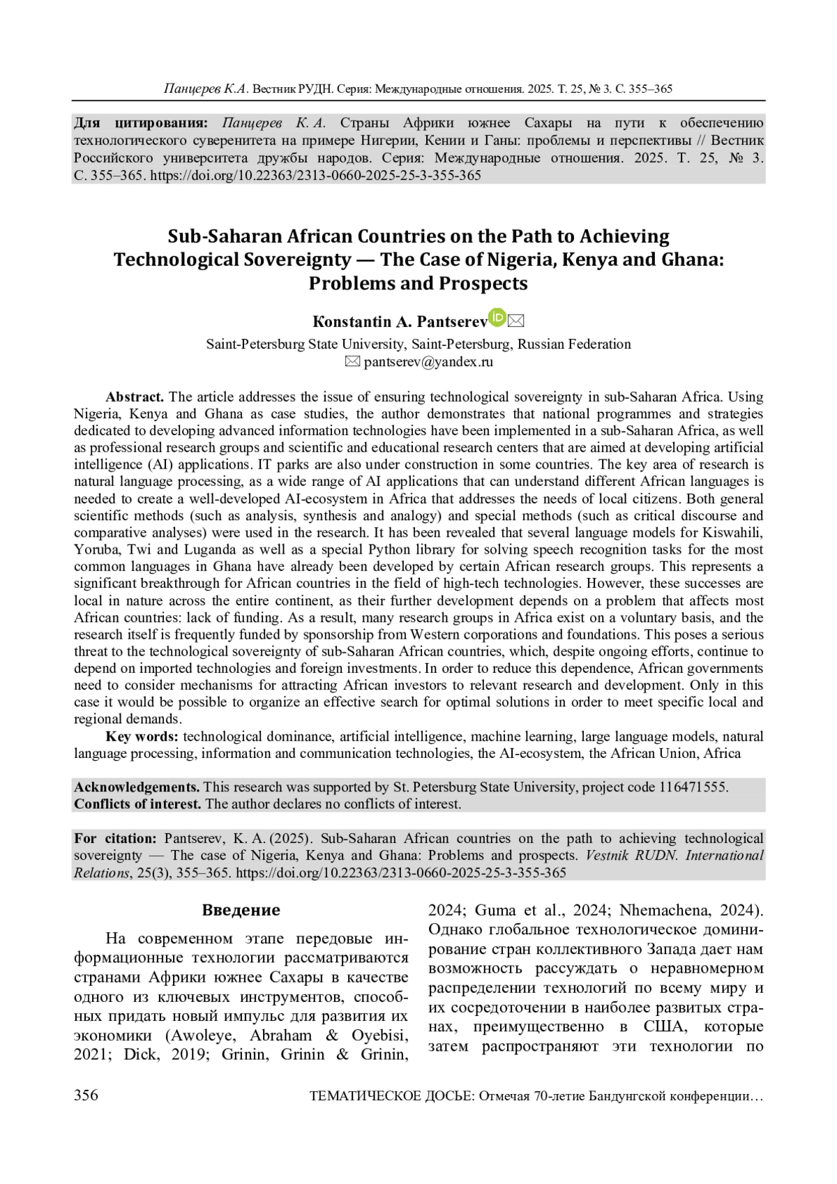 ПАНЦЕРЕВ К. А. СТРАНЫ АФРИКИ ЮЖНЕЕ САХАРЫ НА ПУТИ К ОБЕСПЕЧЕНИЮ ТЕХНОЛОГИЧЕСКОГО СУВЕРЕНИТЕТА НА ПРИМЕРЕ НИГЕРИИ, КЕНИИ И ГАНЫ: ПРОБЛЕМЫ И ПЕРСПЕКТИВЫ // ВЕСТНИК РОССИЙСКОГО УНИВЕРСИТЕТА ДРУЖБЫ НАРОДОВ. СЕРИЯ: МЕЖДУНАРОДНЫЕ ОТНОШЕНИЯ. 2025. ТОМ 25 № 3