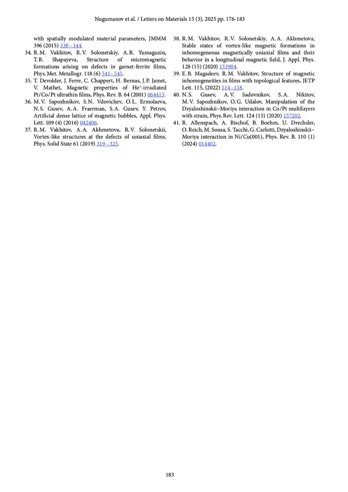 НУГУМАНОВ А. Г., АБДРАХМАНОВ Д. И., НУГУМАНОВ Р. Р., ШАРАФУЛЛИН И. Ф. SKYRMIONS IN PERFORATED MAGNETIC FILM WITH DZYALOSHINSKII−MORIYA INTERACTION // ПИСЬМА О МАТЕРИАЛАХ. 2025. № 3 (59), ТОМ 15