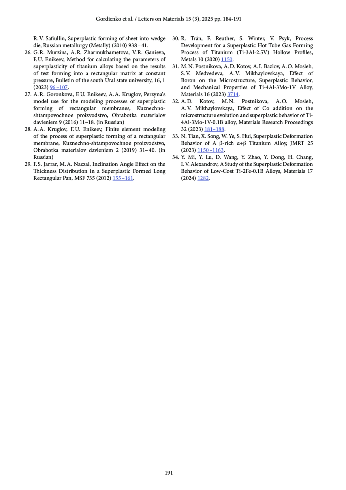 31. M. N. Postnikova, A. D. Kotov, A. I. Bazlov, A. O. Mosleh, S. V. Medvedeva, A. V. Mikhaylovskaya, Effect of Boron on the Microstructure, Superplastic Behavior, and Mechanical Properties of Ti-4Al-3Mo-1V Alloy, Materials 16 (2023) 3714. DOI: 10.3390/ma16103714