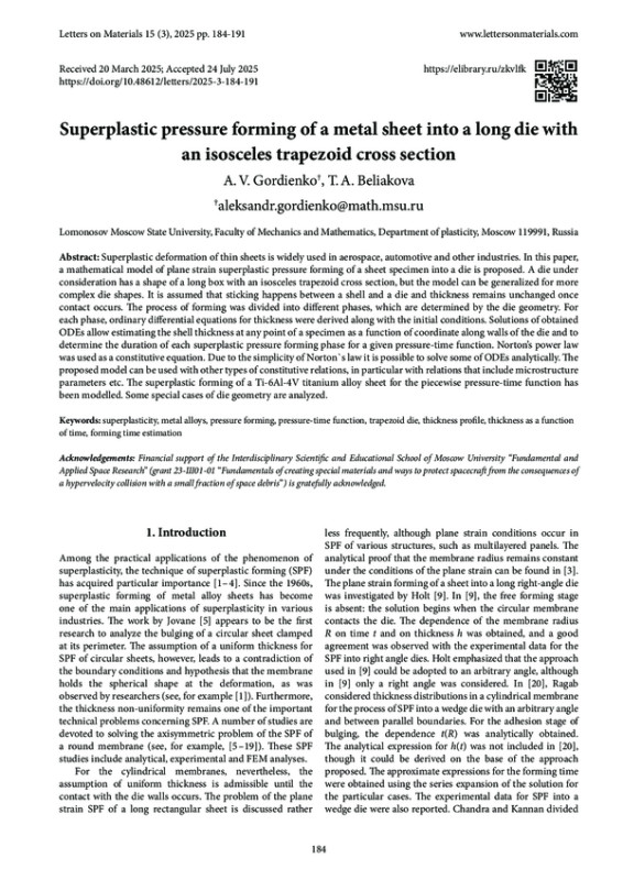 26. G. R. Murzina, A. R. Zharmukhametova, V. R. Ganieva, F. U. Enikeev, Method for calculating the parameters of superplasticity of titanium alloys based on the results of test forming into a rectangular matrix at constant pressure, Bulletin of the south Ural state university, 16, 1 (2023) 96 -107. DOI: 10.14529/mmp230108