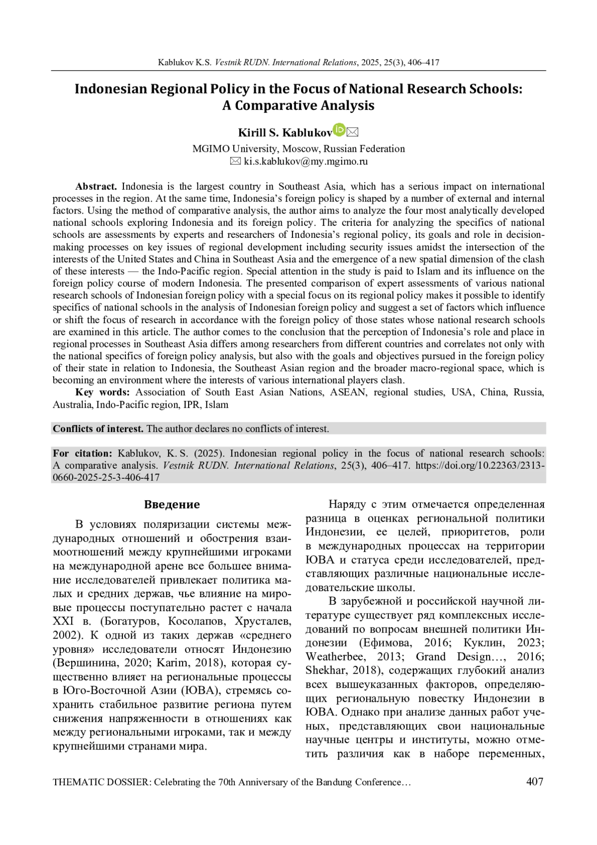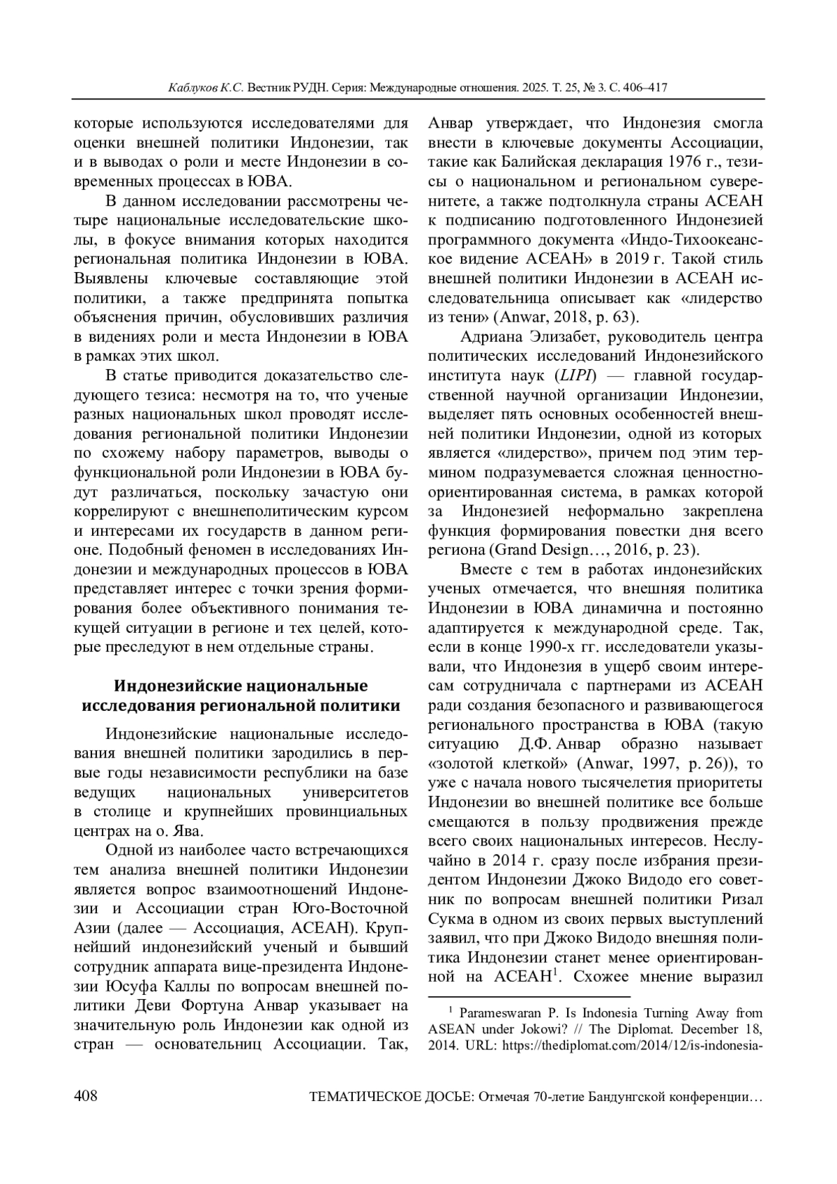 КАБЛУКОВ К. С. РЕГИОНАЛЬНАЯ ПОЛИТИКА ИНДОНЕЗИИ В ФОКУСЕ НАЦИОНАЛЬНЫХ ИССЛЕДОВАТЕЛЬСКИХ ШКОЛ: СРАВНИТЕЛЬНЫЙ АНАЛИЗ // ВЕСТНИК РОССИЙСКОГО УНИВЕРСИТЕТА ДРУЖБЫ НАРОДОВ. СЕРИЯ: МЕЖДУНАРОДНЫЕ ОТНОШЕНИЯ. 2025. ТОМ 25 № 3