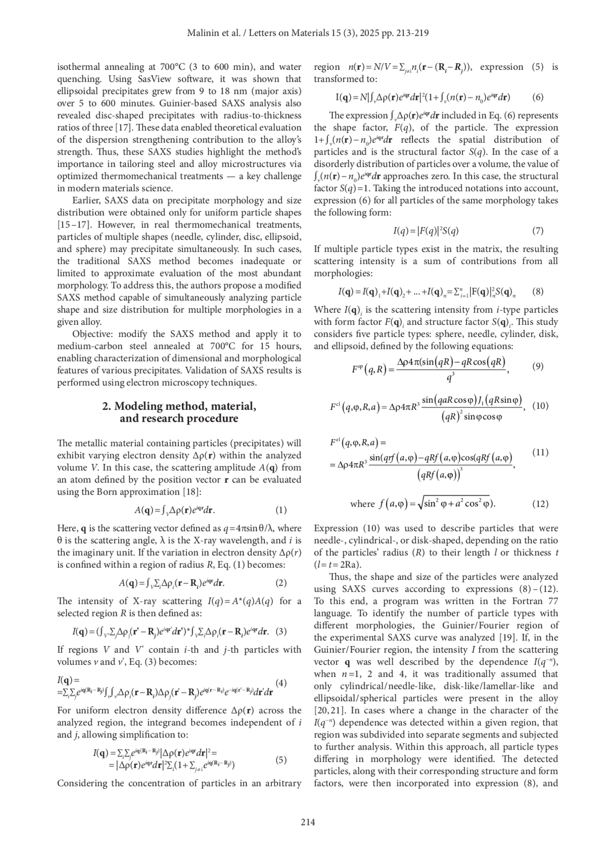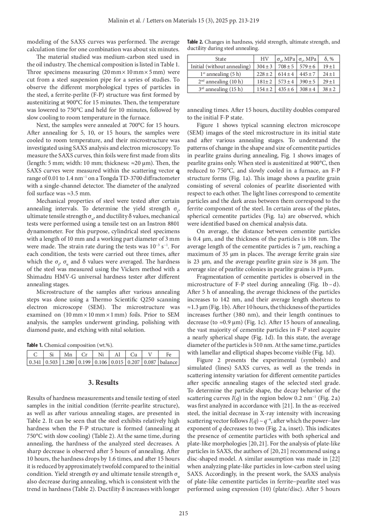 This paper presents a modified small-angle X-ray scattering (SAXS) method for analyzing the size and shape of hardening particles in steels. Unlike the conventional SAXS approach, which typically analyzes alloy particles of only one morphology, the modified method enables simultaneous evaluation of various types of particles differing in both size and morphology. The essence of the modification to SAXS method is that it takes into account the contribution of the intensity of the separate types of particles with different morphologies to the total true intensity. For each type of particles, shape and structural coefficients are set taking into account their spatial distribution in the analyzed area. To detect the presence of particles of different morphologies in alloys, the experimental patterns are analyzed. First, based on the I(q−n) dependence, the morphology of the existing types of particles was traditionally identified (cylinder / needle (n =1), plate / disk (n = 2), and ellipsoid / sphere (n = 3, 4)). Subsequently, individual regions of the SAXS curve were analyzed in the context of optimizing the size and shape of various particles. The modified SAXS method was tested for analyzing the morphology and size of cementite particles in ferrite-pearlite steel subjected to annealing. As a result, it was shown that during the annealing process of steel, cementite particle morphology in pearlite grains undergoes a stepwise transformation according to the following scheme: lamellar → ellipsoidal → spherical. For the first time, quantitative characteristics of the change in particle size distribution were obtained for different morphologies. The transformation of cementite particle morphology was found to be accompanied by growth, which leads to a decrease in the contribution of dispersion hardening.