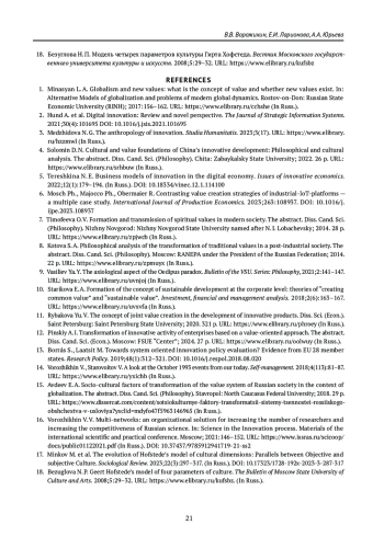 17. Минков М. и др. Эволюция модели культурных измерений Хофстеде: параллели между объективной и субъективной культурой. Социологическое обозрение. 2023;22(3):297-317. https://doi.org/10.17323/1728-192x-20233-287-317
