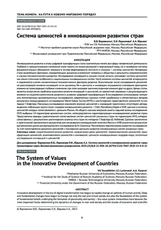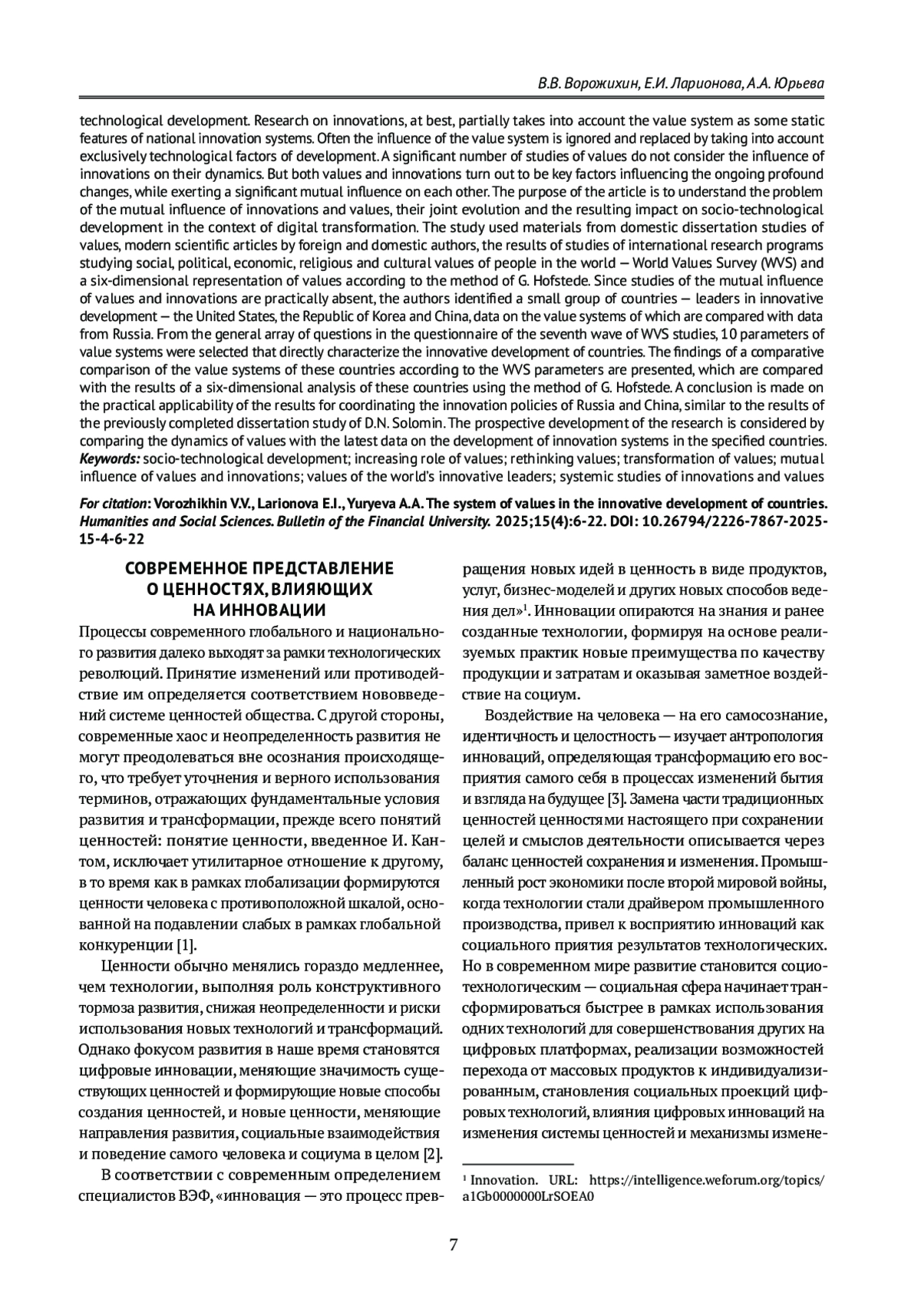 Инновационное развитие в эпоху цифровой трансформации стало стремительно менять все сферы человеческой деятельности. Глубокие и принципиальные изменения стали менять не только реальный и виртуальный миры, но и основания системы фундаментальных убеждений, лежащих в основе формирования личности и социума — системы ценностей. Инновации стали важнейшим фактором, определяющим динамику изменений человека и общества и результаты экономического и научно-технологического развития. Исследования инноваций в лучшем случае отчасти учитывают систему ценностей как некие статичные особенности национальных инновационных систем. Часто влияние системы ценностей игнорируется и подменяется учетом исключительно технологических факторов развития. Значительное число исследований ценностей не рассматривает влияние инноваций на их динамику. Но и ценности, и инновации оказываются ключевыми факторами влияния на происходящие глубокие изменения, при этом оказывая значимое взаимное влияние друг на друга. Целью статьи является осмысление проблемы взаимного влияния инноваций и ценностей, их совместной эволюции и результирующего влияния на социотехнологическое развитие в условиях цифровой транс формации. В исследовании использованы материалы отечественных диссертационных исследований, современных научных статей зарубежных и отечественных авторов, результаты международного исследования World Values Survey (WVS) и шестимерного представления ценностей по методике Г. Хофстеде. Поскольку исследования взаимного влияния ценностей и инноваций практически отсутствуют, авторы выделили небольшую группу стран–лидеров инновационного развития — США, Республику Корея и КНР, данные о системах ценностей которых сопоставляются с данными России. Из общего массива вопросов анкеты седьмой волны исследований WVS выбраны 10 параметров ценностных систем, непосредственно характеризующих инновационное развитие стран. Представлены выводы сравнительного сопоставления систем ценностей указанных стран по параметрам WVS, которые сопоставлены с результатами шестимерного анализа этих стран по методике Г. Хофстеде (G. Hofstede). Сделано заключение о практической применимости результатов для согласования инновационной политики России и КНР, аналогично результатам выполненного ранее диссертационного исследования Д. Н. Соломина. Рассмотрено перспективное развитие исследования за счет сопоставления динамики ценностей с последними данными развития инновационных систем указанных стран.