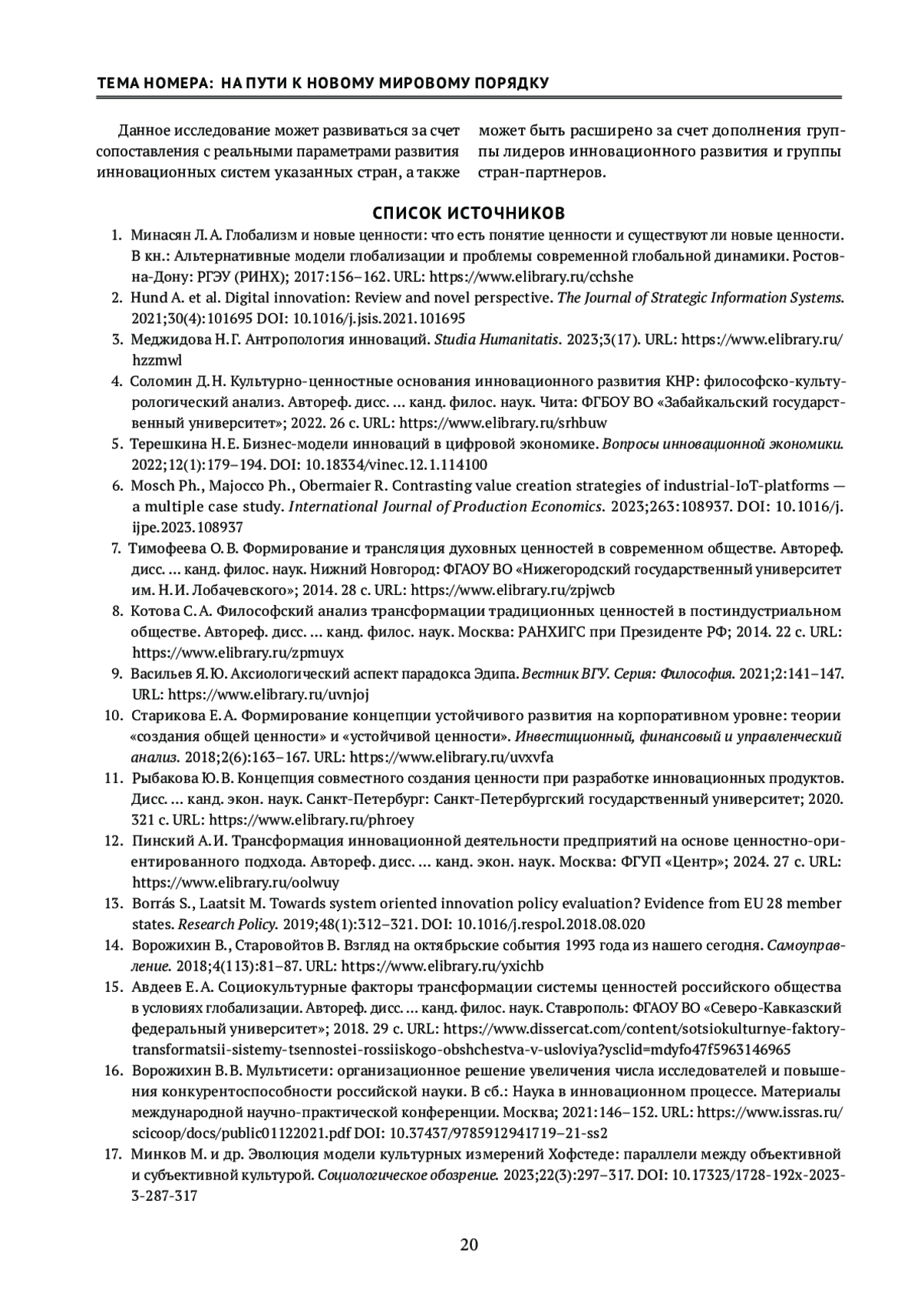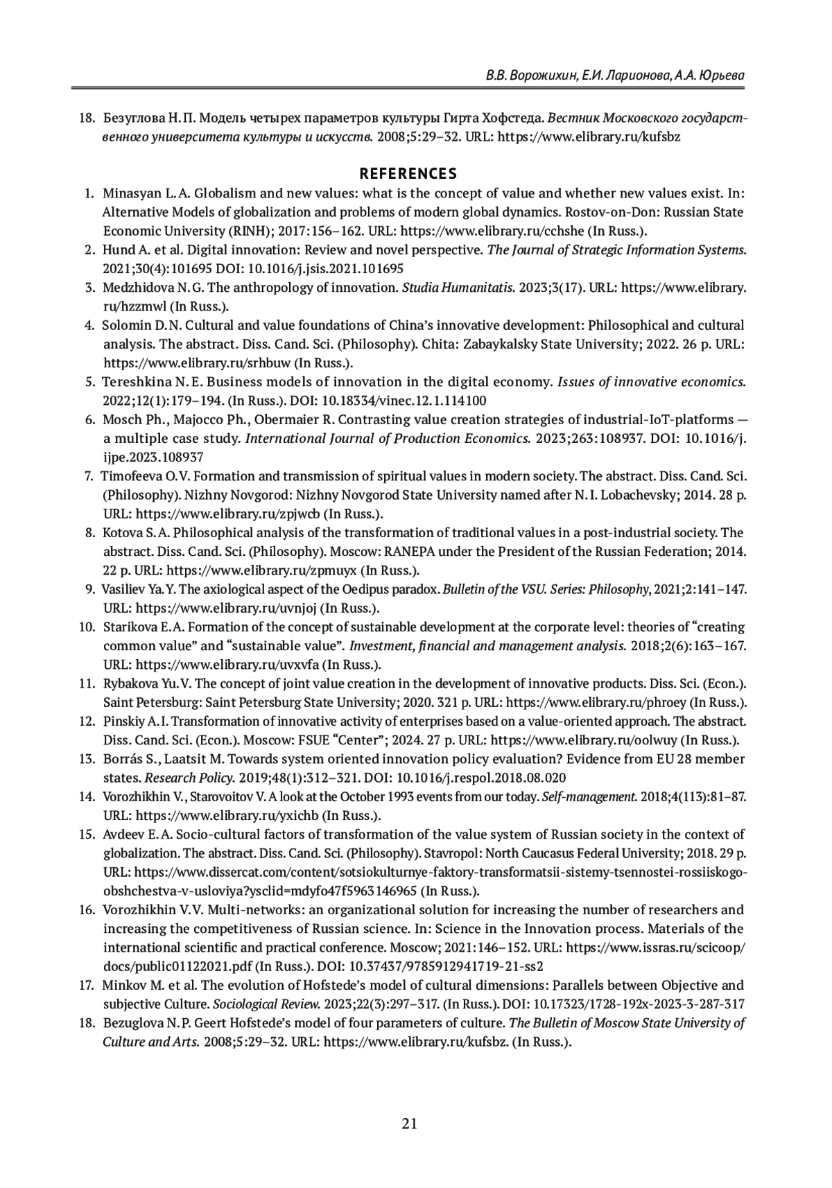 12. Пинский А. И. Трансформация инновационной деятельности предприятий на основе ценностно-ориентированного подхода. Автореф. дисс. … канд. экон. наук. Москва: ФГУП «Центр»; 2024. 27 с. URL: https://www.elibrary.ru/oolwuy