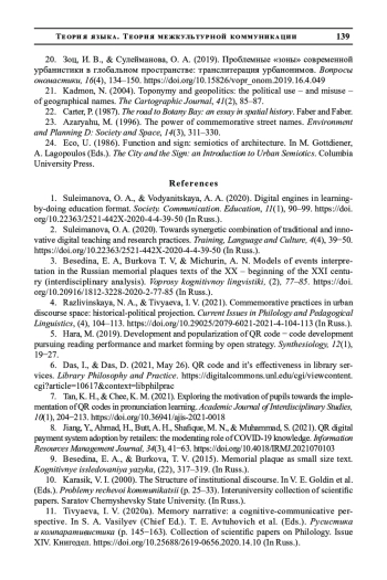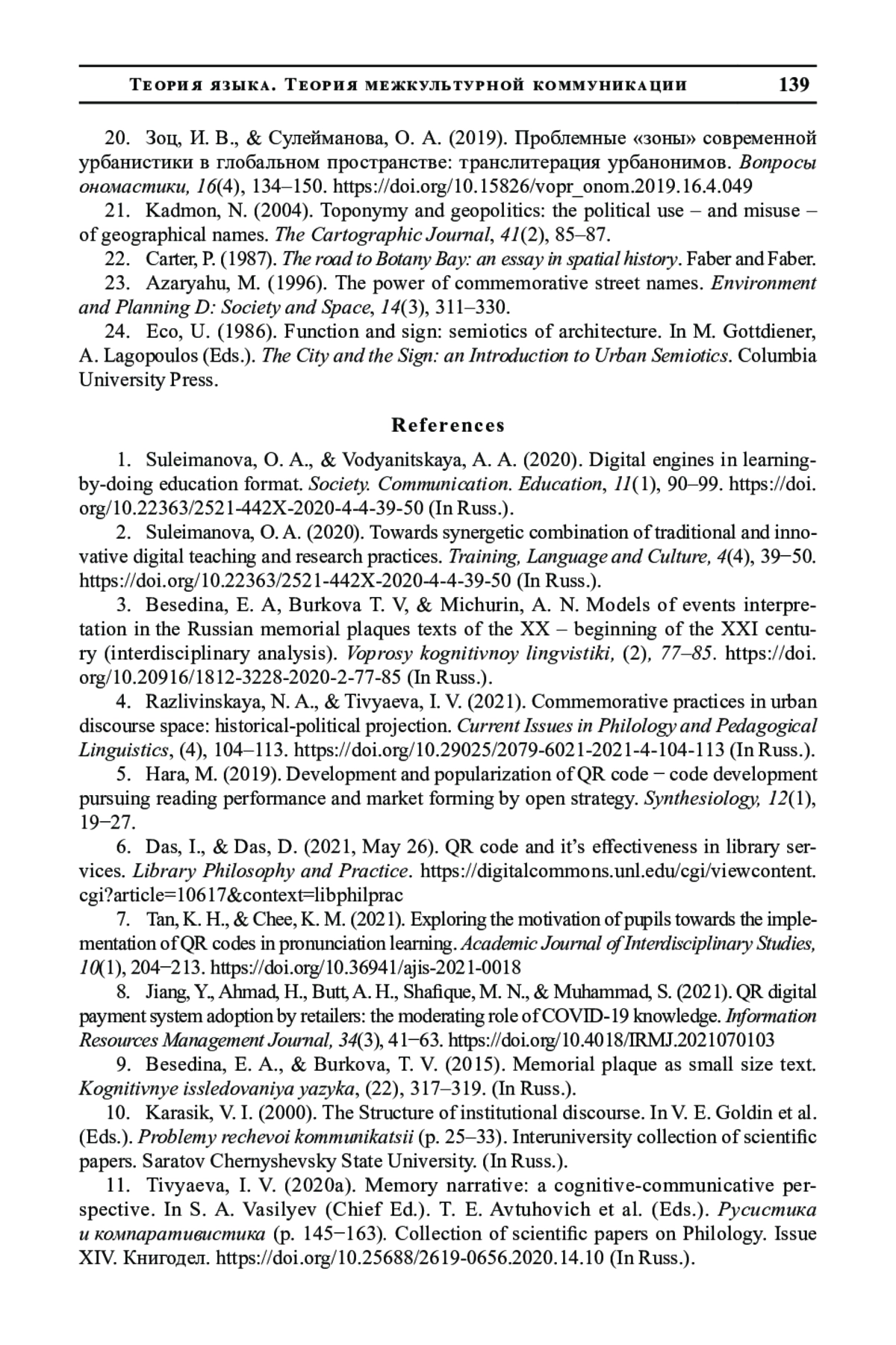20. Зоц, И. В., & Сулейманова, О. А. (2019). Проблемные “зоны” современной урбанистики в глобальном пространстве: транслитерация урбанонимов. Вопросы ономастики, 16(4), 134-150. DOI: 10.15826/vopr_onom.2019.16A049 EDN: PNMWDP