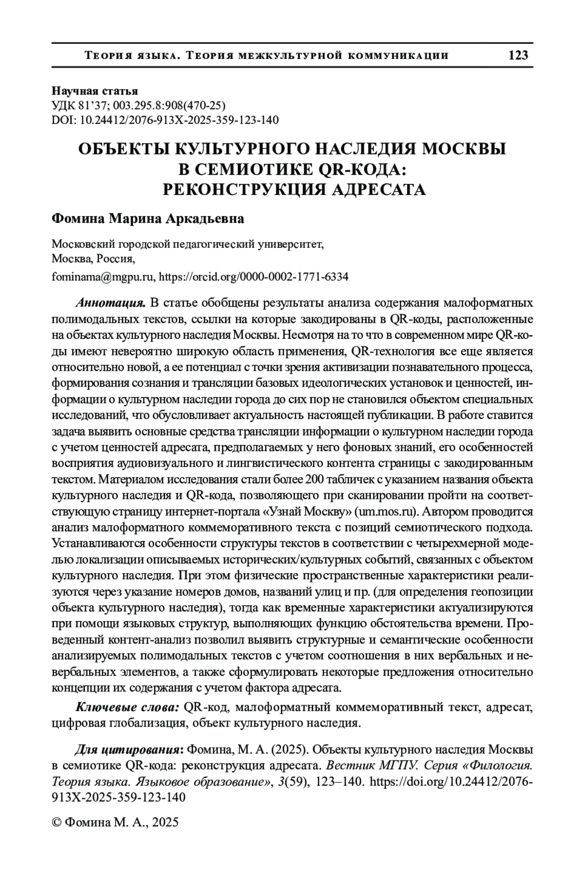 В статье обобщены результаты анализа содержания малоформатных полимодальных текстов, ссылки на которые закодированы в QR-коды, расположенные на объектах культурного наследия Москвы. Несмотря на то что в современном мире QR-коды имеют невероятно широкую область применения, QR-технология все еще является относительно новой, а ее потенциал с точки зрения активизации познавательного процесса, формирования сознания и трансляции базовых идеологических установок и ценностей, информации о культурном наследии города до сих пор не становился объектом специальных исследований, что обусловливает актуальность настоящей публикации. В работе ставится задача выявить основные средства трансляции информации о культурном наследии города с учетом ценностей адресата, предполагаемых у него фоновых знаний, его особенностей восприятия аудиовизуального и лингвистического контента страницы с закодированным текстом. Материалом исследования стали более 200 табличек с указанием названия объекта культурного наследия и QR-кода позволяющего при сканировании пройти на соответствующую страницу интернет-портала «Узнай Москву» (um. mos. ru). Автором проводится анализ малоформатного коммеморативного текста с позиций семиотического подхода. Устанавливаются особенности структуры текстов в соответствии с четырехмерной моделью локализации описываемых исторических/культурных событий, связанных с объектом культурного наследия. При этом физические пространственные характеристики реализуются через указание номеров домов, названий улиц и пр. (для определения геопозиции объекта культурного наследия), тогда как временные характеристики актуализируются при помощи языковых структур, выполняющих функцию обстоятельства времени. Проведенный контент-анализ позволил выявить структурные и семантические особенности анализируемых полимодальных текстов с учетом соотношения в них вербальных и невербальных элементов, а также сформулировать некоторые предложения относительно концепции их содержания с учетом фактора адресата.