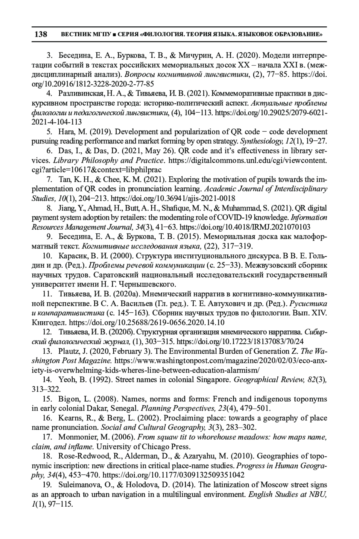 4. Разливинская, Н. А., & Тивьяева, И. В. (2021). Коммеморативные практики в дискурсивном пространстве города: историко-политический аспект. Актуальные проблемы филологии и педагогической лингвистики, (4), 104-113. DOI: 10.29025/2079-6021-2021-4-104-113 EDN: HAUUVF