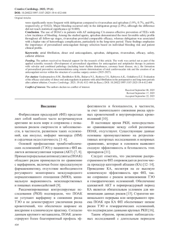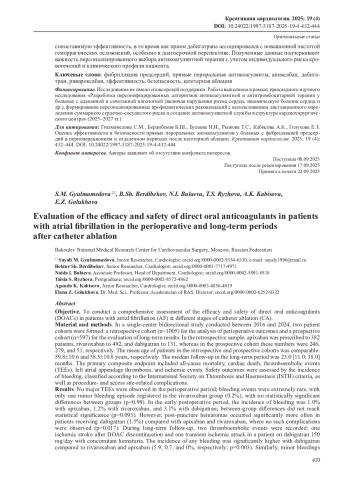 Заключение. Применение ПОАК у пациентов с ФП после КА обеспечивает эффективную профилактику ТЭО при низкой частоте кровотечений. Среди изученных препаратов апиксабан продемонстрировал наиболее благоприятный профиль безопасности на всех этапах наблюдения, ривароксабан обеспечивал сопоставимую эффективность, в то время как прием дабигатрана ассоциировался с повышенной частотой геморрагических осложнений, особенно в долгосрочной перспективе. Полученные данные подчеркивают важность персонализированного выбора антикоагулянтной терапии с учетом индивидуального риска кровотечений и клинического профиля пациента.