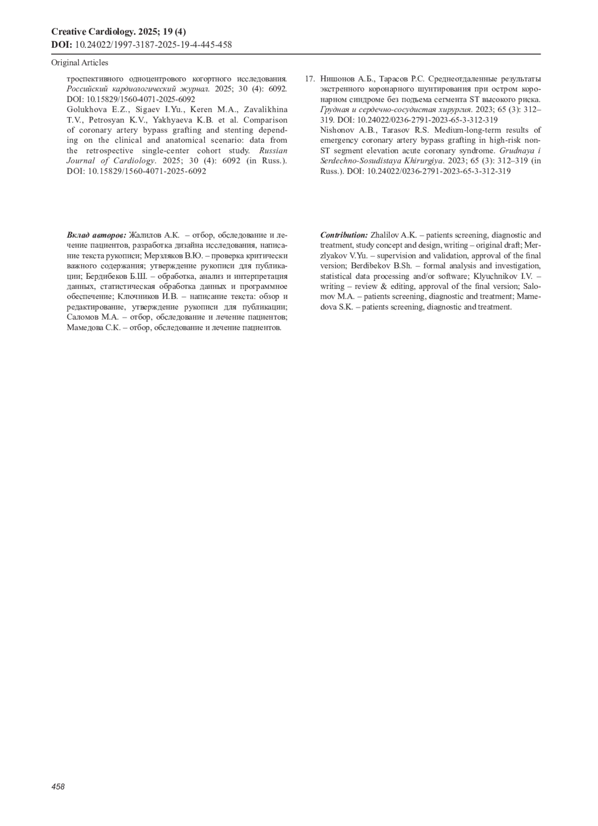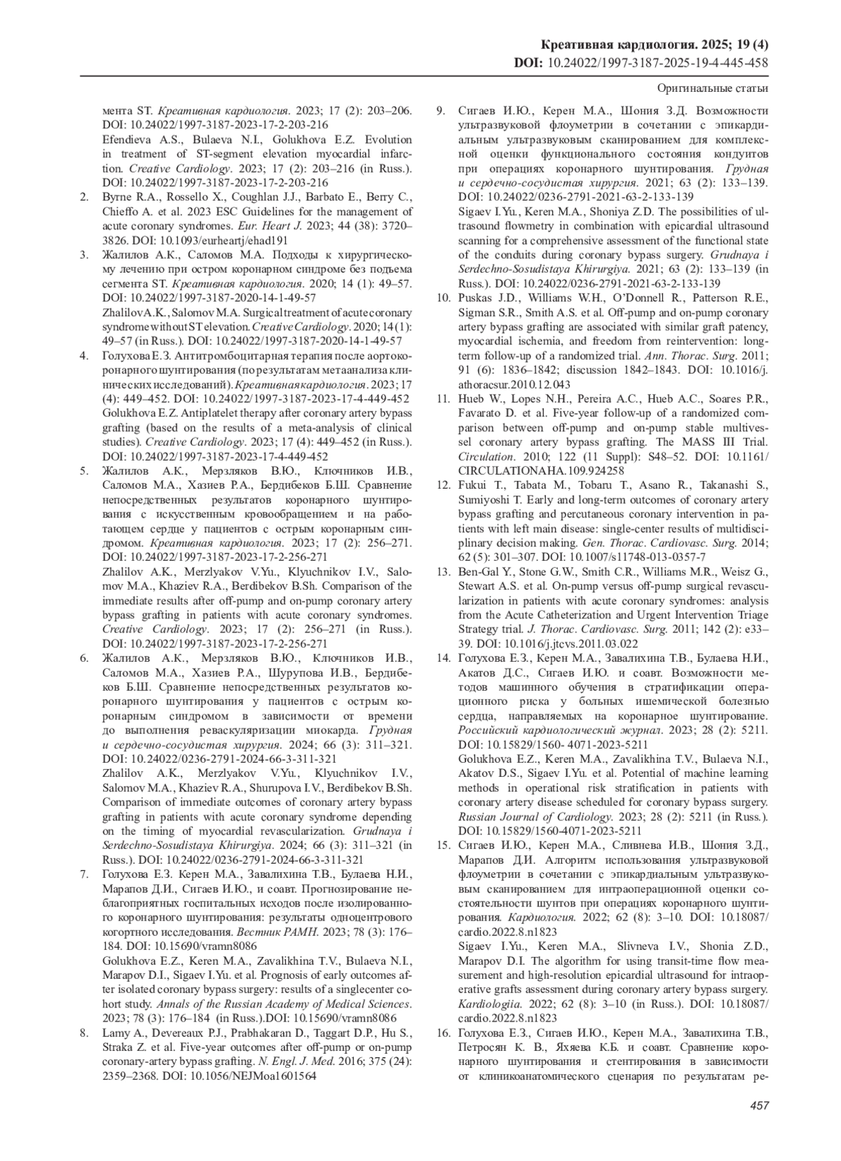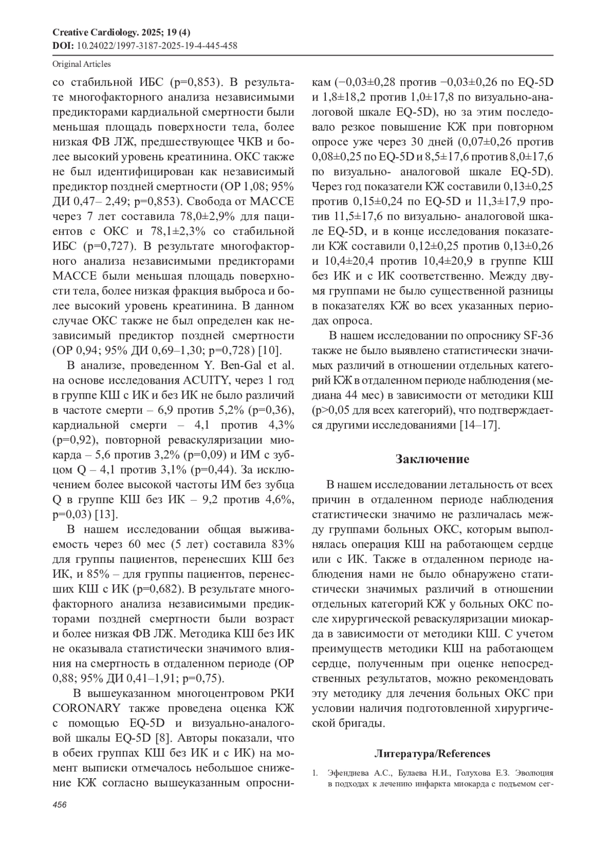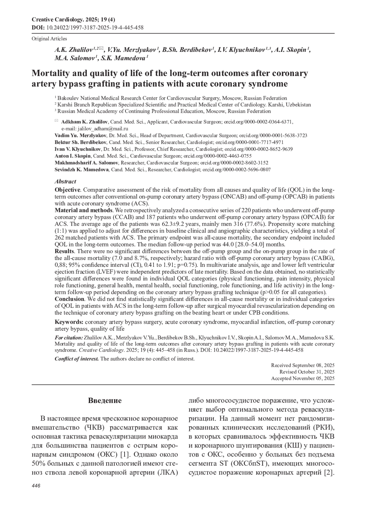 ЖАЛИЛОВ А. К., МЕРЗЛЯКОВ В. Ю., БЕРДИБЕКОВ Б. Ш., КЛЮЧНИКОВ И. В., СКОПИН А. И., САЛОМОВ М. А., МАМЕДОВА С. К. ЛЕТАЛЬНОСТЬ И КАЧЕСТВО ЖИЗНИ В ОТДАЛЕННОМ ПЕРИОДЕ ПОСЛЕ КОРОНАРНОГО ШУНТИРОВАНИЯ У БОЛЬНЫХ С ОСТРЫМ КОРОНАРНЫМ СИНДРОМОМ // КРЕАТИВНАЯ КАРДИОЛОГИЯ. 2025. № 4, ТОМ 19