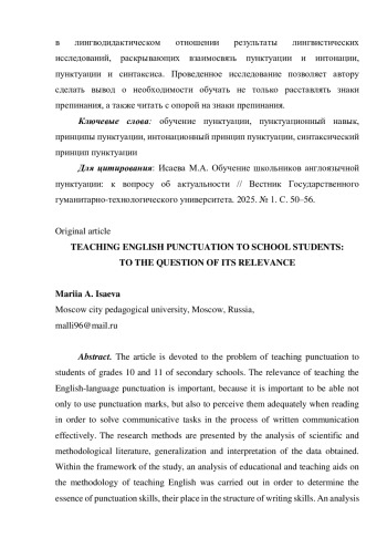 Данная статья посвящена проблеме обучения пунктуационной стороне иноязычной речи учащихся 10 и 11 классов средней общеобразовательной школы. Актуальность обучения англоязычной пунктуации представляется значимой, поскольку для эффективного решения коммуникативных задач в процессе письменного речевого общения важно уметь не только применять знаки препинания, но и адекватно их воспринимать при чтении. Методы исследования представлены анализом научно-методической литературы, обобщением и интерпретацией полученных данных. В рамках исследования проведен анализ учебных и учебно-методических пособий по методике обучения английскому языку с целью определить сущность пунктуационных навыков, их место в структуре умений письменной речи. Представлен анализ современных УМК, которые используются в 10 и 11 классах, отражающий обучение этому феномену. Особое внимание уделяется принципам пунктуации, лежащим в основе русской и английской пунктуационных систем. В статье приведены значимые в лингводидактическом отношении результаты лингвистических исследований, раскрывающих взаимосвязь пунктуации и интонации, пунктуации и синтаксиса. Проведенное исследование позволяет автору сделать вывод о необходимости обучать не только расставлять знаки препинания, а также читать с опорой на знаки препинания.