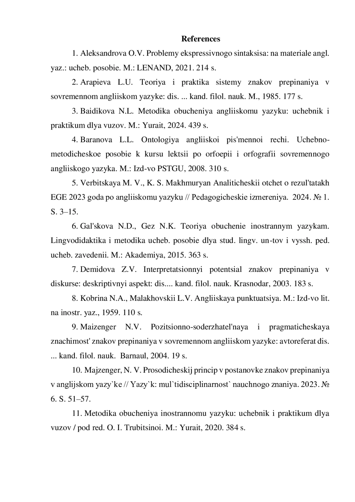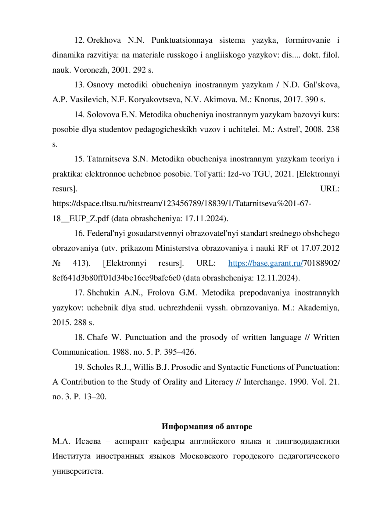 12. Орехова Н.Н. Пунктуационная система языка, формирование и динамика развития: на материале русского и английского языков: дис.... докт. филол. наук. Воронеж, 2001. 292 с. EDN: LHSXJB