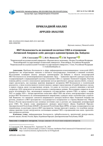 Статья: ИКТ-БЕЗОПАСНОСТЬ ВО ВНЕШНЕЙ ПОЛИТИКЕ США В ОТНОШЕНИИ ЛАТИНСКОЙ АМЕРИКИ: КЕЙС ДИСКУРСА АДМИНИСТРАЦИИ ДЖ. БАЙДЕНА (2025)